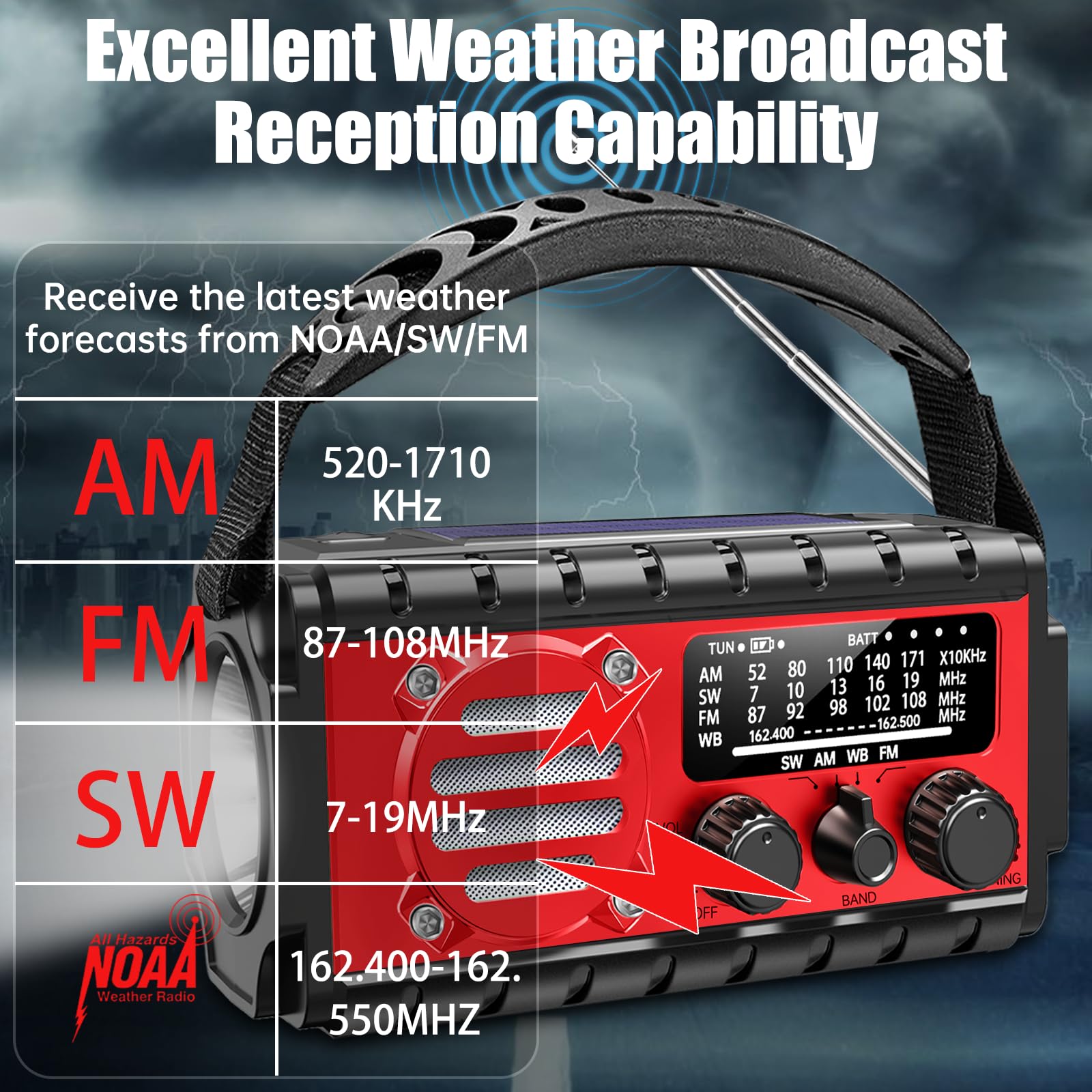 - [Emergency-Ready] NOAA Weather Radio with 360° Signal Reception--The Aivica emergency crank radio features a 20.5" telescopic antenna for precise NOAA/AM/FM/SW band reception, delivering critical alerts for hurricanes, tornadoes, blizzards, and wildfires. Built-in noise reduction chip ensures clear broadcasts during power outages. Ideal for remote camping or mountain emergencies, keeping you connected when networks fail.
