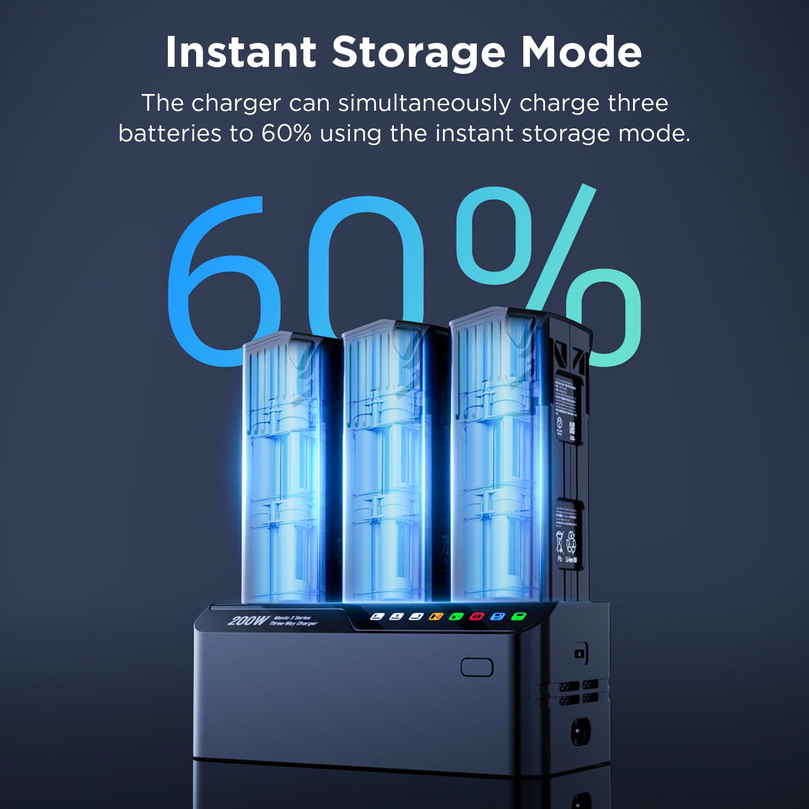 - 【Storage Mode & Outdoor Portability】The NOITI 200W Mavic 3 Series Fast Charging Hub is space-efficient for outdoor use. Hold the function key for 2 seconds to activate storage mode,This charges all three Mavic 3 series drone batteries to about 60%, making it perfect for long-term storage when you're not using the device. You have the option to choose either 60% or 100% charging mode to suit your.