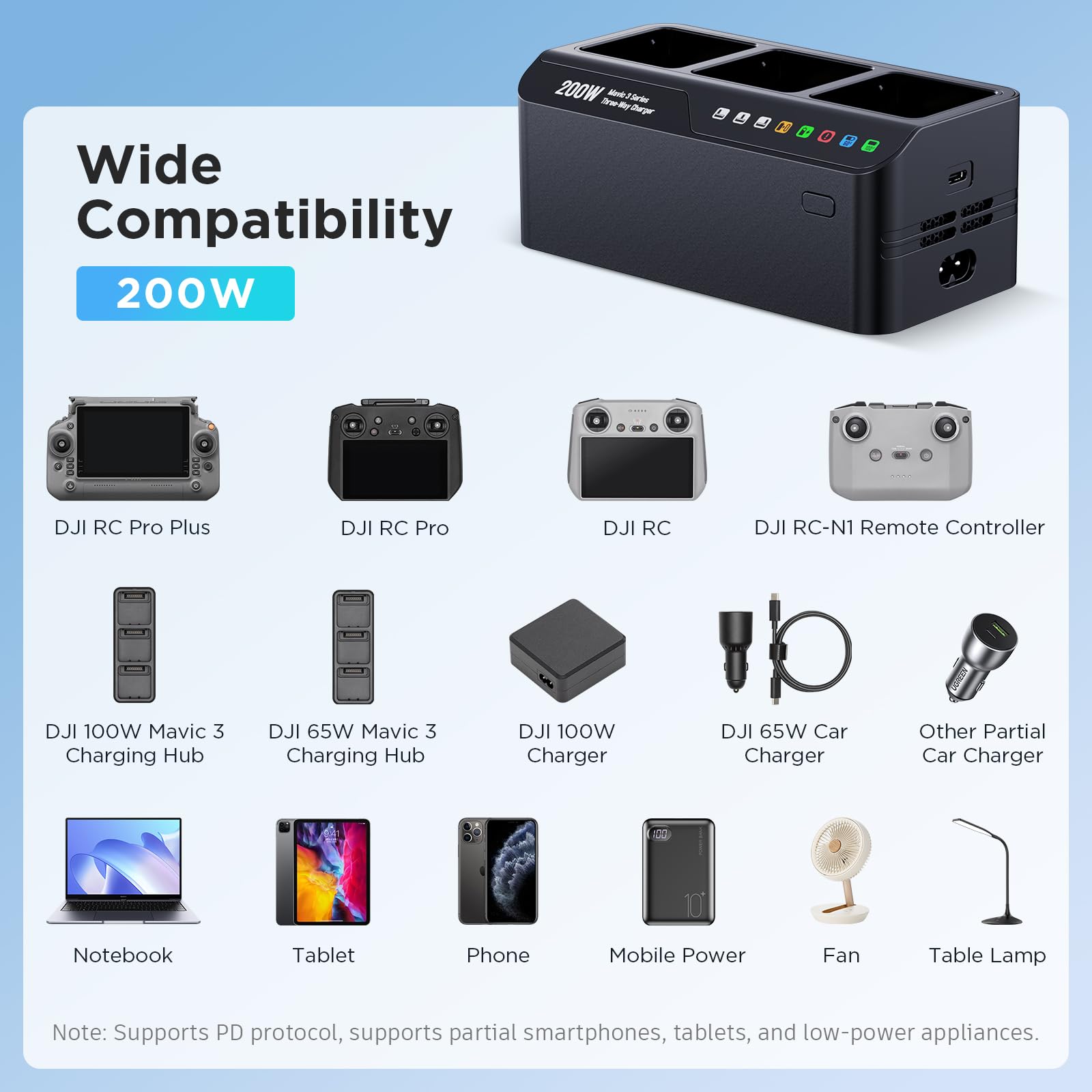 - 【Multi-Device Simultaneous Charging】The NOITI 200W Fast Mavic 3 Battery supports dual charging configurations. Charge a Mavic 3, Mavic 3 Pro, or Mavic 3 Classic battery alongside a compatible remote controller (RC Pro Plus, RC Pro, RC, or RC N1) or any USB-C device, saving you time and space. Output Power: 100W, max.