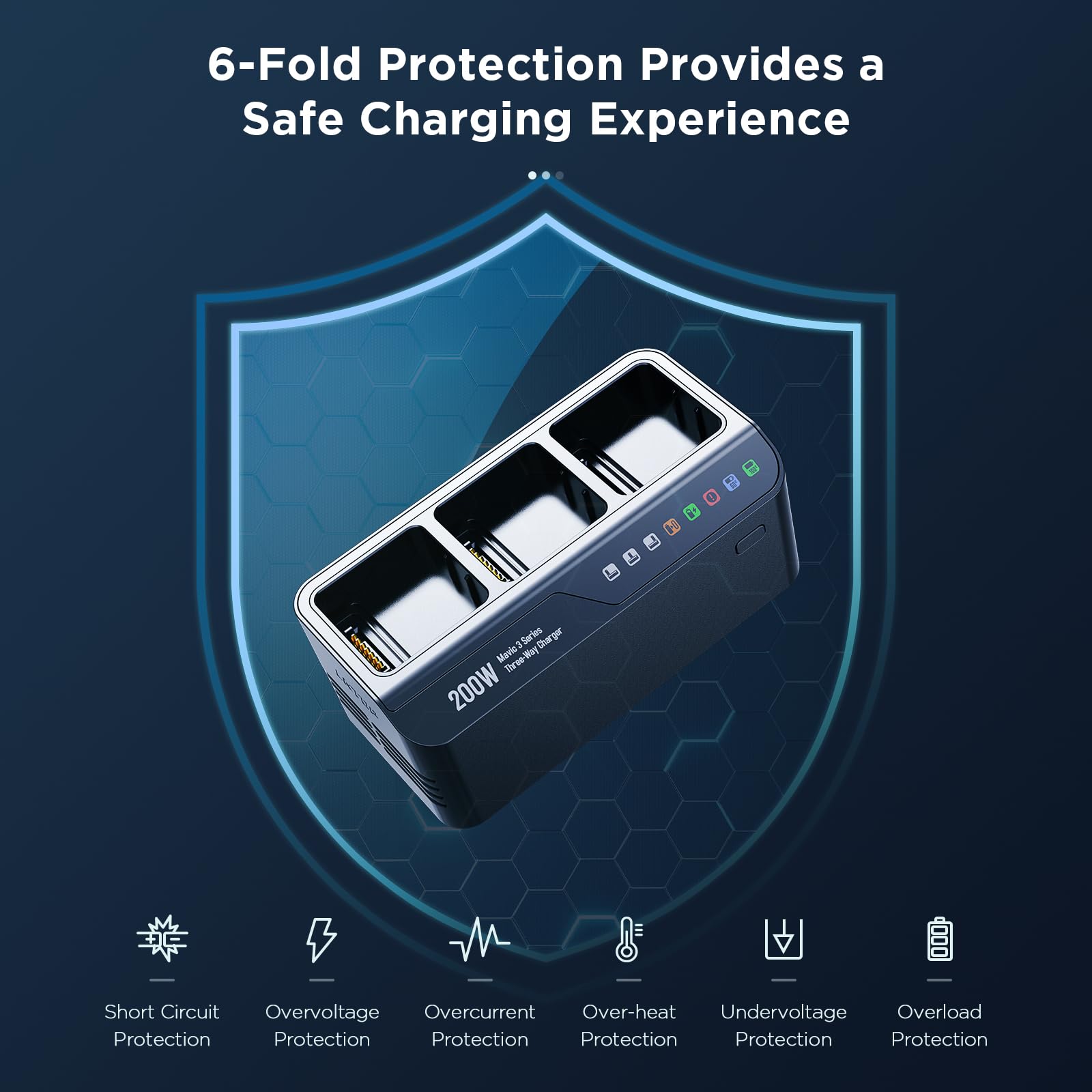 - 【Battery Protection】Our Mavic 3 Pro battery charger provides comprehensive protection, shielding your drone batteries from overcurrent, overvoltage, short circuits, overheating, low voltage, and overloading. This ensures both the safety of your equipment and the longevity of your batteries, guaranteeing sustained, high-performance operation for the long term