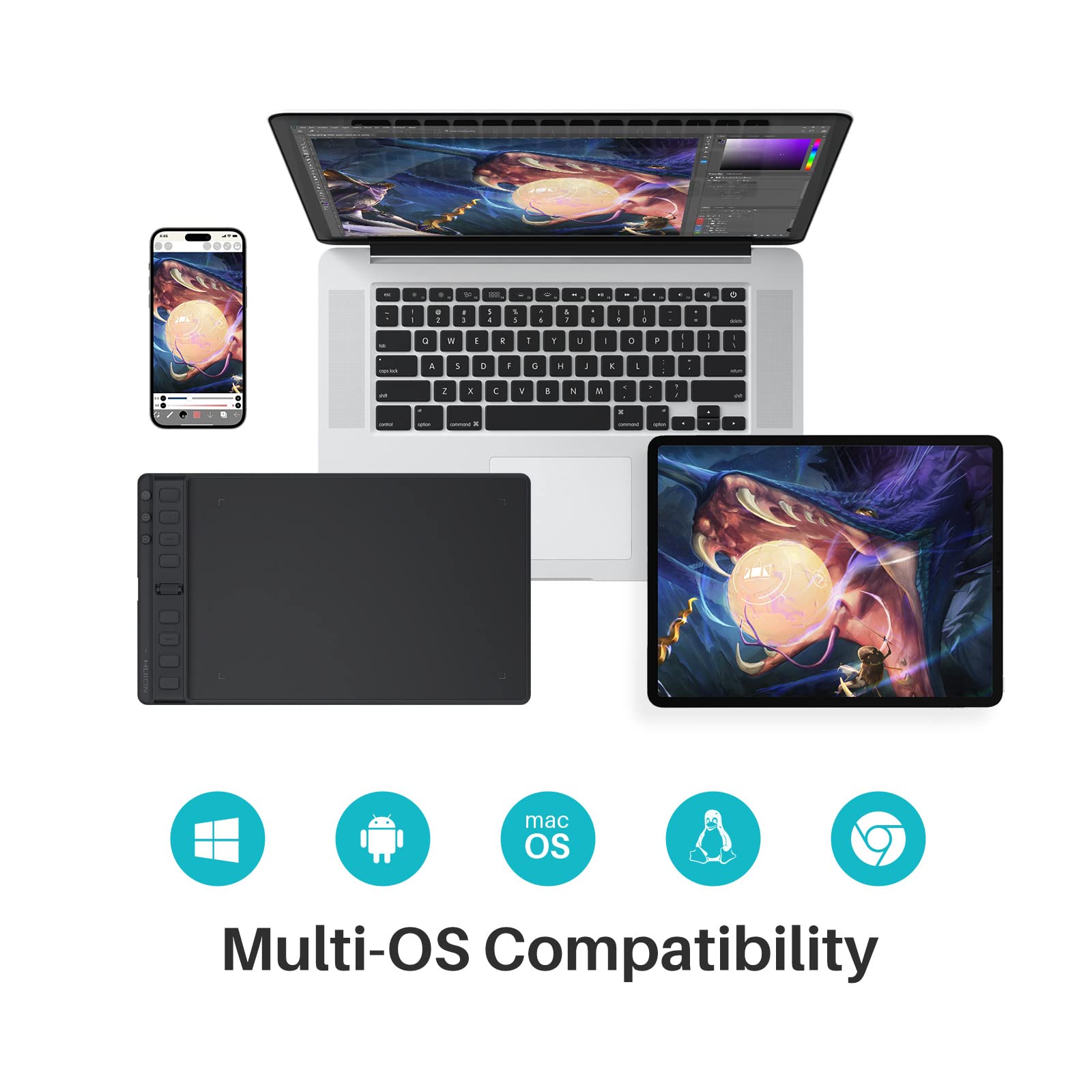- Multi-OS Compatibility: Inspiroy 2 pen tablet is compatible with Mac (MacOS 10.12 or later), PC (Windows 7 or later), Linux(Ubuntu) and certain Android devices (OS version 6.0 or later).