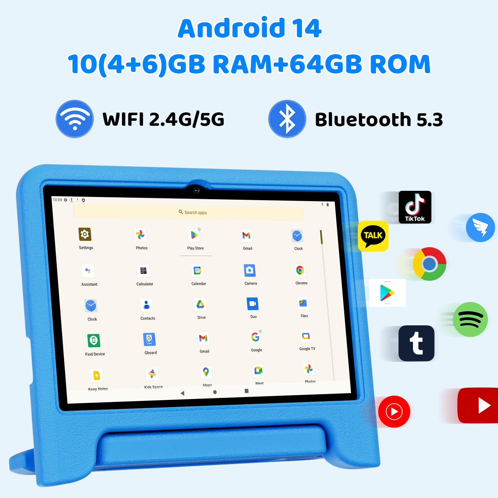 2024 Upgraded Kids Tablet, Octa-core, 10 Inch Android 14 Tablet for Kids with Case, 6000mAh Battery with Kids Space, Parental Control, Dual WiFi6, Kids App Pre-Installed, Great Gift for Children