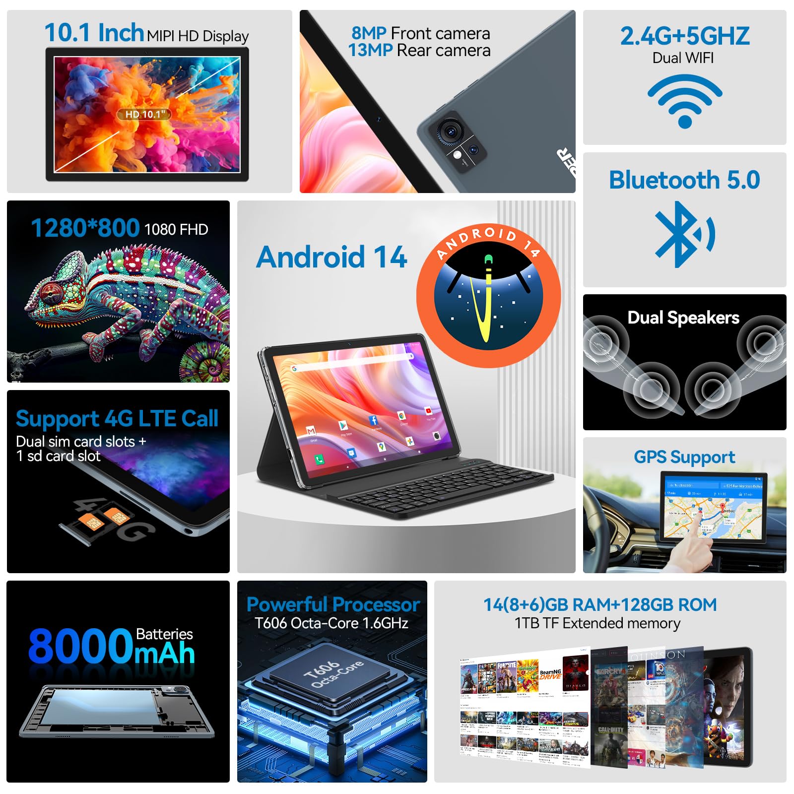 2025 Android 14 Tablet 10 inch,4G Cellular Tablets with 2 SIM 1 SD slot,5G Wifi Android Tablet 128GB ROM +14GB RAM(1TBTF),3-in-1 Tablet with Keyboard-8000mAh,Octa-core,1080FHD,13MP+8MP,GPS-Gray