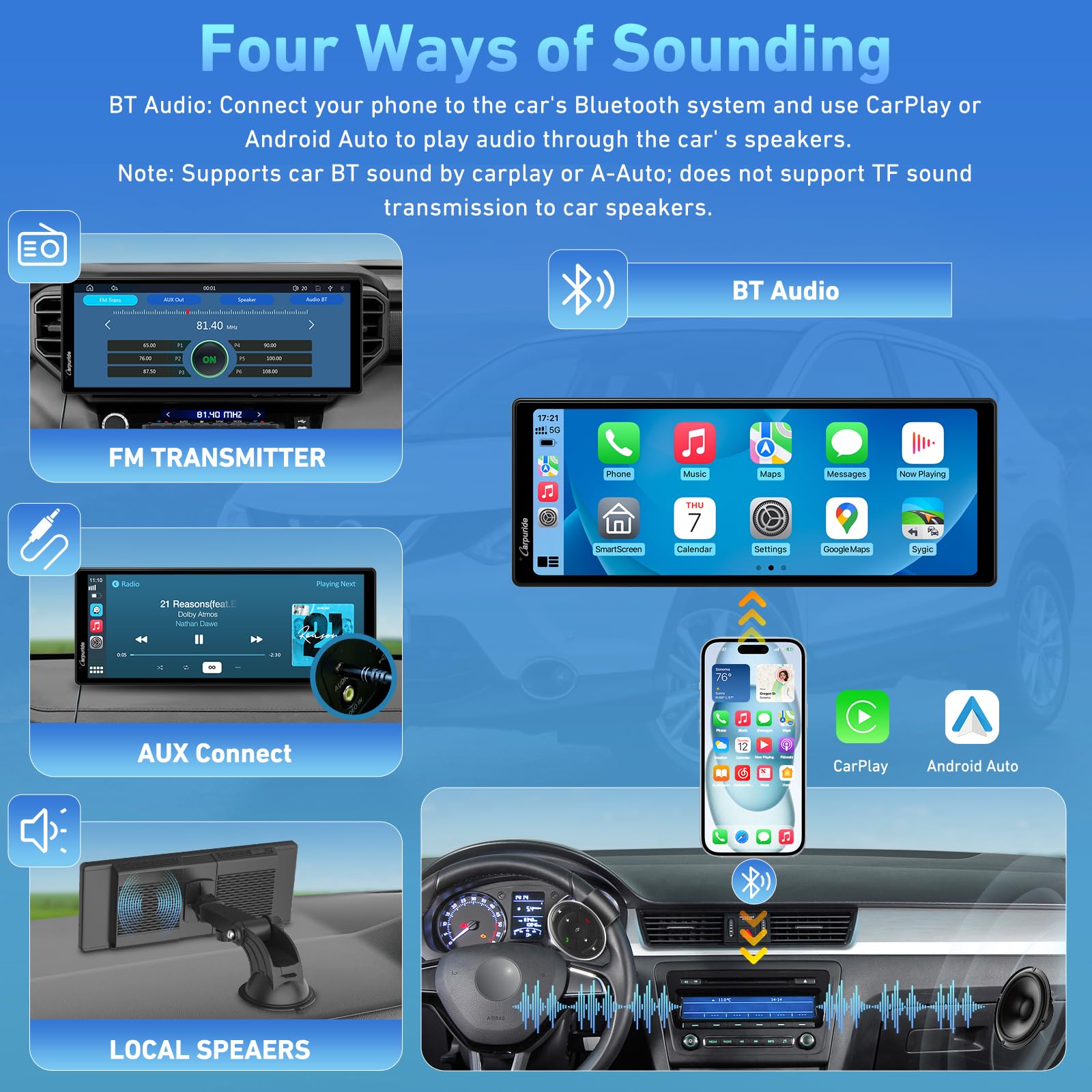 - 【Multiple Sound Modes Design】The Carpuride C92 Car Stereo provides enhanced Bluetooth audio output, supporting Apple CarPlay and Android Auto for seamless connectivity with your phone for hands-free calls. Enjoy audio playback through your car's speakers, built-in speakers, TF card, USB, AUX cable, or FM transmission. The thoughtfully designed interface makes it easy to hide cables, enhancing the overall aesthetic and saving space.