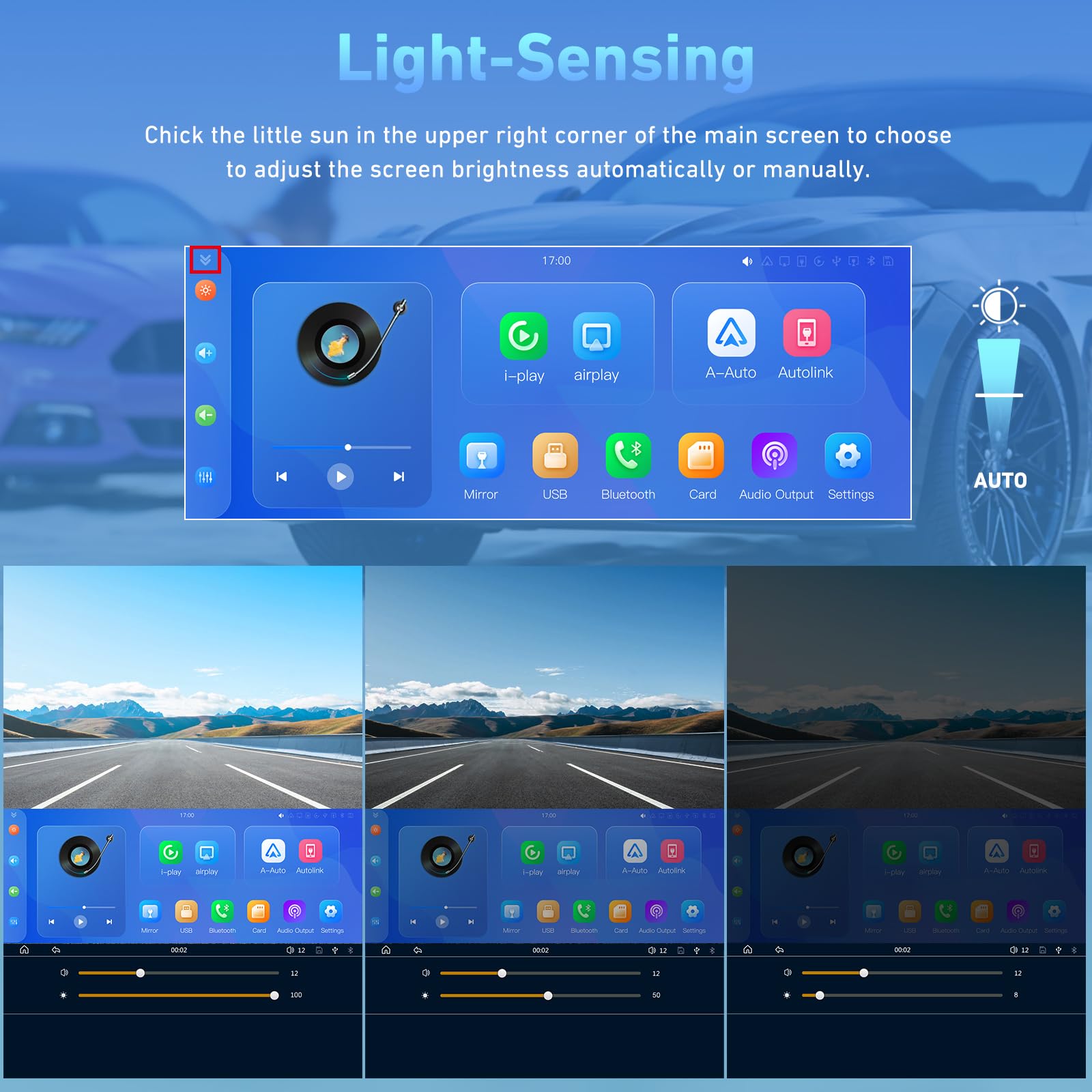 - 【Adaptive Sensor Light Design】The Carpuride sensor Light is specifically designed to protect your eyes while driving. When you drive through a tunnel, the sensor light will automatically dim the display. when you exit the tunnel, the sensor light will automatically brighten the display to prevent eye strain and ensure optimal visibility. The carpruide 9.3 inch display has 10 levels of brightness adjustment. And supports manual adjustment of screen brightness.