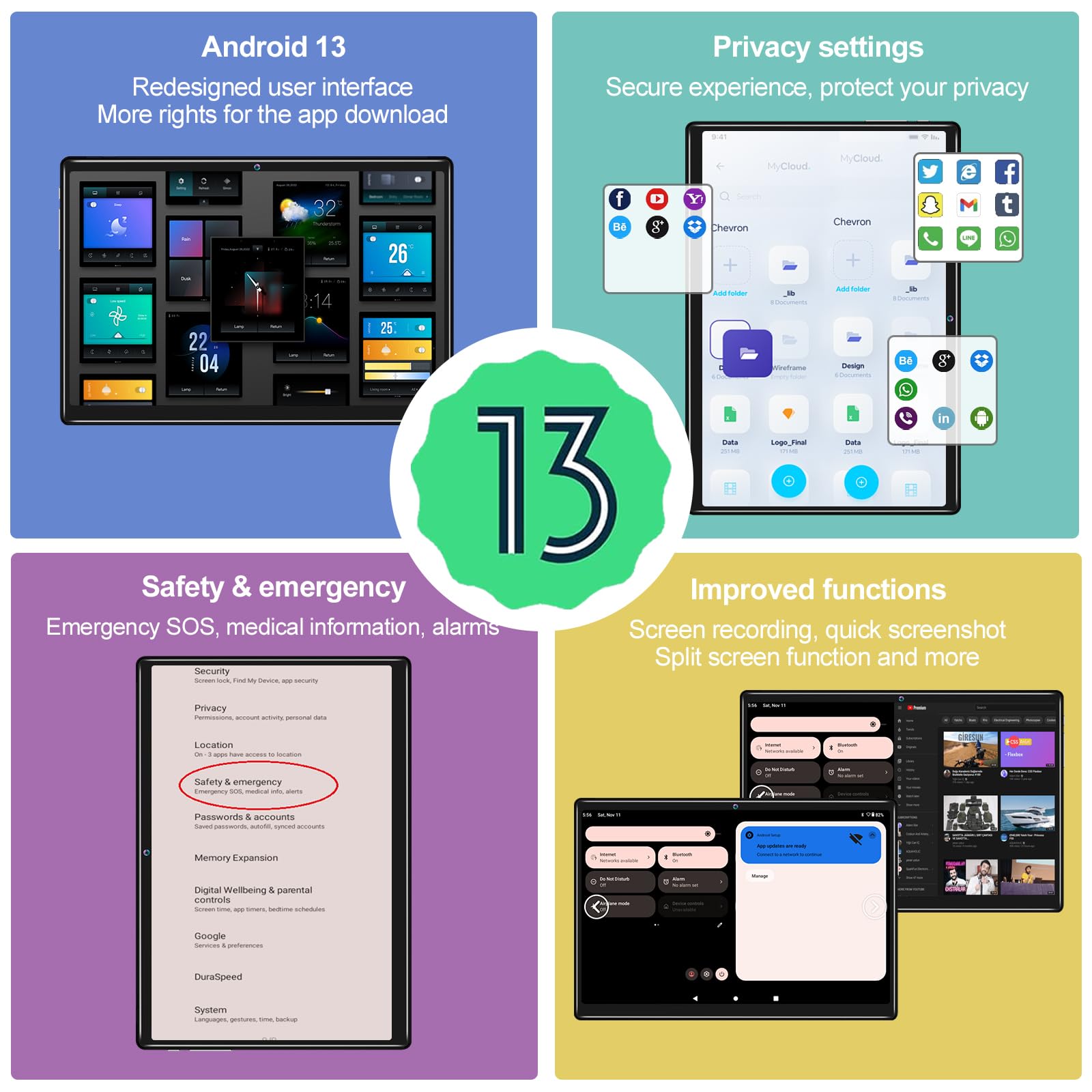 - 【2025 Newest Updated Android 13】The ANTEMPER android tablet is powered by Android 13, the new UI interface design offers user privacy protection features to ensure greater security. With Google GMS-certified Android 13, you can access and download all your favorite apps from the Google Play shop. In PC mode, you can easily view apps on the split screen, manage multifunctional windows, and customize icons for a simpler and smoother experience.