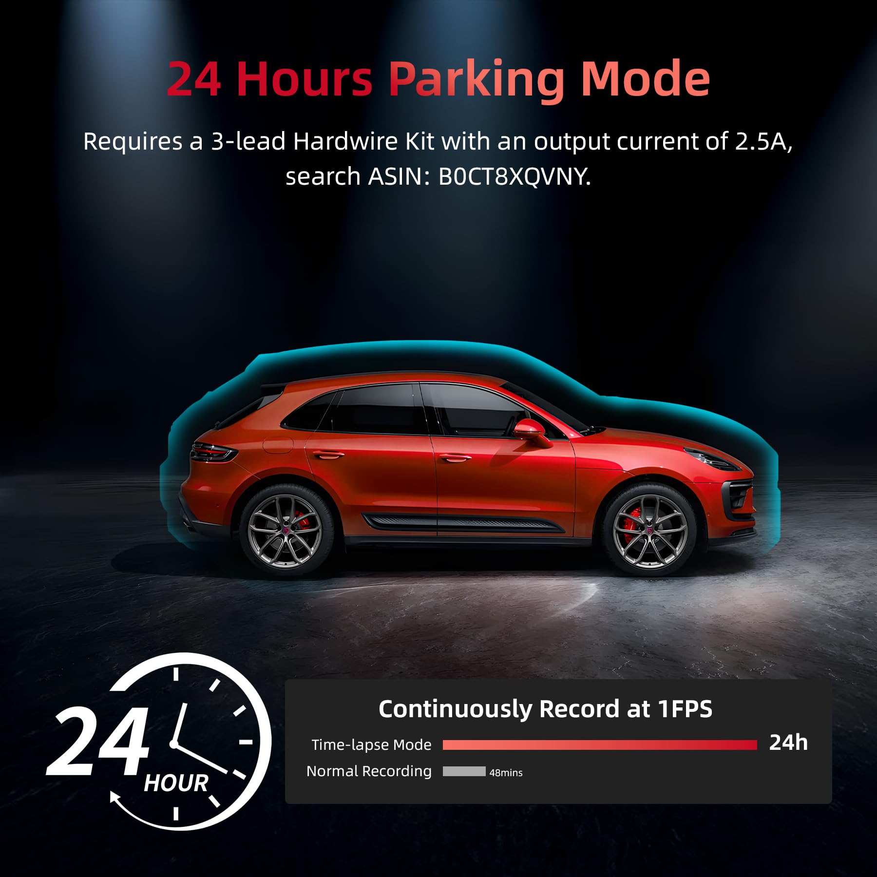 - 🔄【Continuous Recording + Impact Lock + 24/7 Surveillance】The car camera automatically overwrites old footage when storage is full. Instant collision locking preserves crucial evidence. The dash cam parking monitor requires hardwire kit (B0CT8XQVNY). 5G WiFi enables instant video access and sharing.