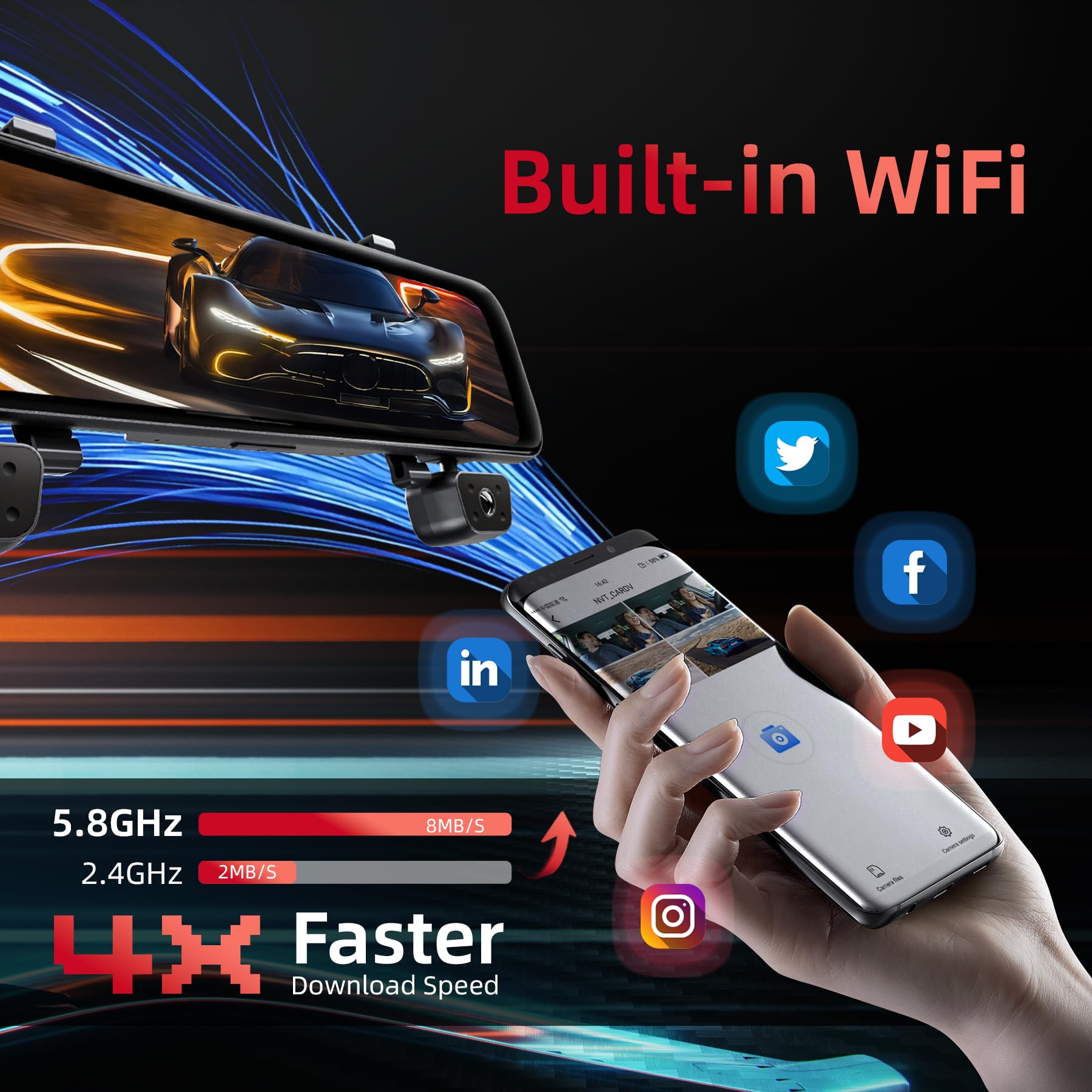 - 📶【5G WiFi + GPS + Reverse Assist】Seamless 5GHz connection to mobile app for dashcam recording live viewing and route tracking. Automatic full-screen display with dynamic guidelines when reversing. Intuitive touch controls for dash camera switching and brightness adjustment.