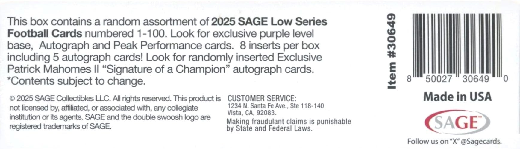 Details: Brand NEW & SUPER HOT! We are Proud to offer this 2025 Sage Football Low Series EXCLUSIVE HUGE Factory Sealed MEGA Box! This Awesome HUGE EXCLUSIVE Factory Sealed MEGA Box includes 8 Packs & 12 Cards Per Pack Including at least (5) AUTOGRAPHS & (8) EXCLUSIVE PURPLE LEVEL INSERTS! This Product is LOADED with ROOKIE Cards! Look for Rookies & Rookie Auto’s of Cam Ward, Dillion Gabriel, Quinshon Judkins, Carson Beck, Luther Burden III, Ashton Jentry, Drew Allan! This Product Not only Includes Rookies & Autos of Future Top 2025 NFL Draft Packs But Also Sneak Peak Rookies & Autos of Future Draft Prospects! Also Look for Rare PATRICK MAHOMES “Signature of Champion” Autograph Cards! Also Look for Foil “Chrome” Style Cards ( Some will be Auto Version for Extra Autos!) plus Peak Performance Cards! This Product is Loaded! Good Luck with Pulls! Thanks