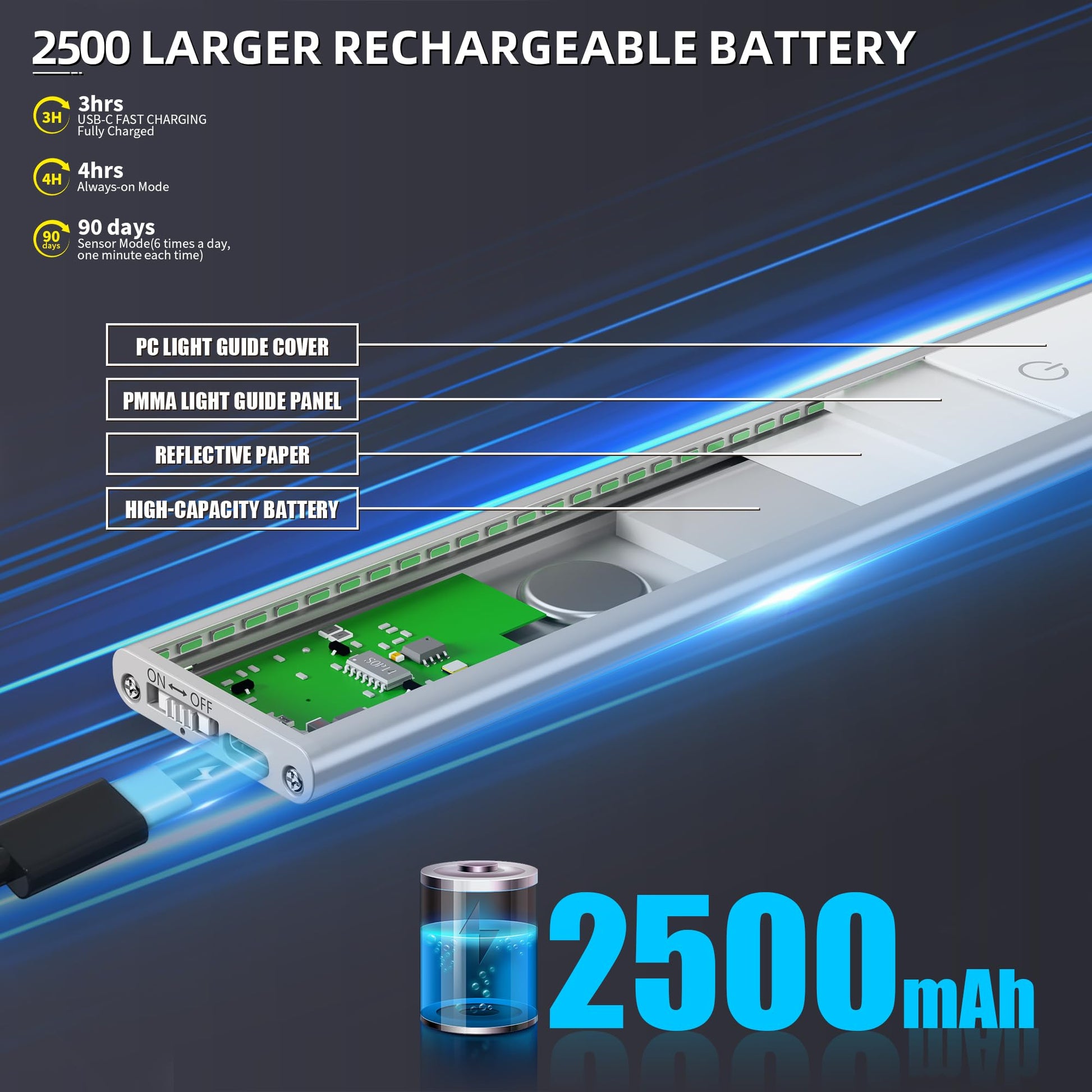- 【Full Lighting No Shadow】The under cabinet light is not only upgraded in battery life, but also better design on the light emitting surface. Complete illumination with no Shadows compared to other products. The 2500mAh high capacity battery ensures the wireless counter light lasts longer, with USB Type-C connecting cable, faster charging speed, 3 hours to be fully charged