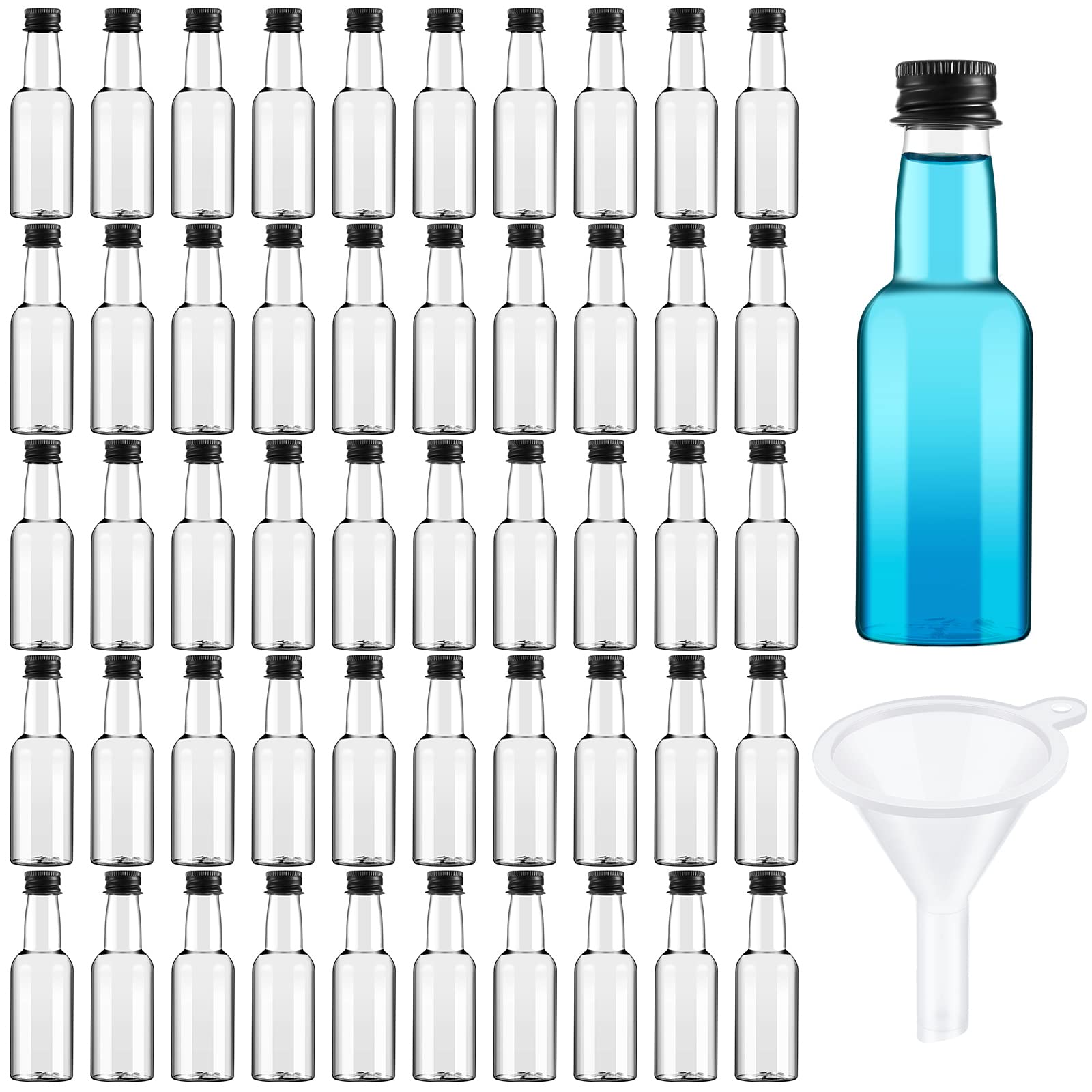 208 Mini Liquor Bottles 1.7 oz Plastic Mini Empty Spirit Bottle with Black Screw Cap Small Wine Hot Sauce Container with Caps Liquid Funnel Easy Pouring Party