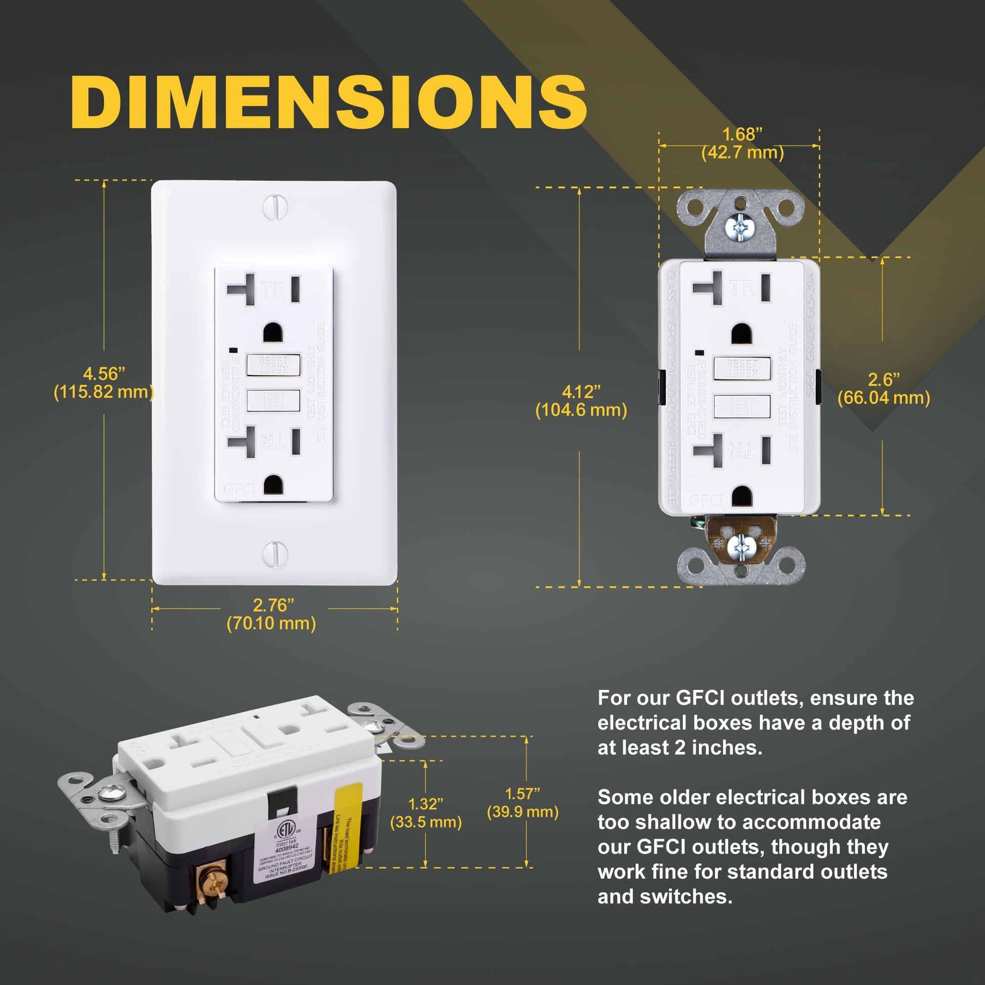 Details: The Faith Electric GLS-20ATR-WH-10 self-testing ground fault circuit interrupter outlet provides continuous protection from ground faults, disconnecting power in 1/40 of a second if a dangerous condition is detected. Once connected to power, this GFCI receptacle automatically self-tests every 2-1/2 hours. The green indicator LED light turns off if the outlet is not receiving power, is broken or if it is at end-of-life. Slimmer, modern design for easier and quicker installation in electrical boxes. Test and reset buttons match the device face color to blend in seamlessly. Meets or exceeds UL943 2015 standards. Compliant with National Electric Code (NEC) requirements. ETL listed. Tamper-resistant shutter safety mechanism blocks access to power unless a plug is inserted, providing an extra layer of safety in households with children. 10 pack. Each pack includes (1)20Amp white TR GFCI receptacle, (1) 4. 59"x 2. 76" white wall plate, (2) screws, installation manual, stickers, US-based customer support