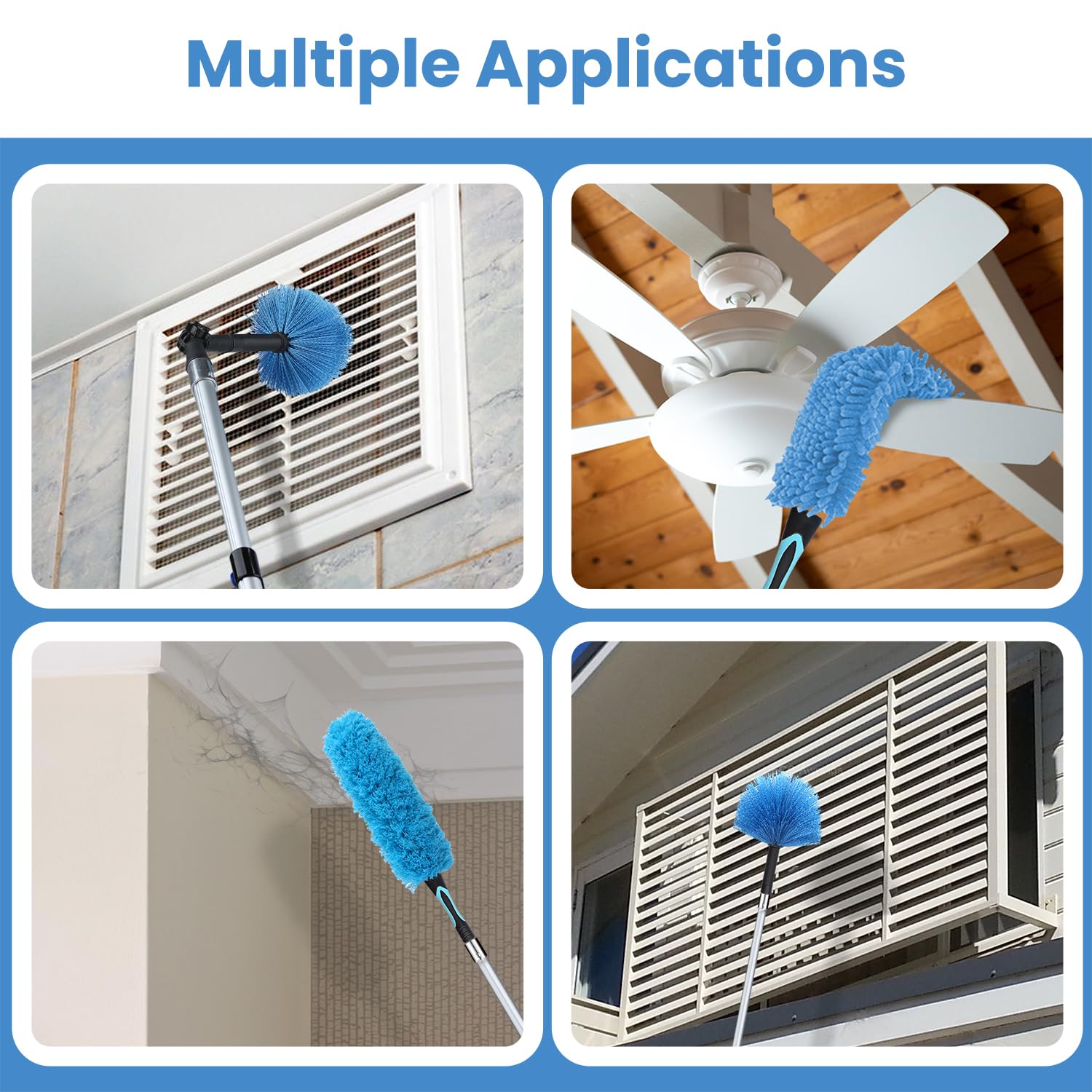 - Easy High Reach Cleaning: High reach up to 20 feet of extended reach, making all your hard-to-reach dust-free in your home, high ceilings, fans, tall furniture, and big windows. The Long duster kits includes 12FT sturdy all-aluminum telescopic pole, flexible high ceiling fan dustercobweb duster, microfiber feather duster, window squeegee cleaner, universal joint and wall rack organizer