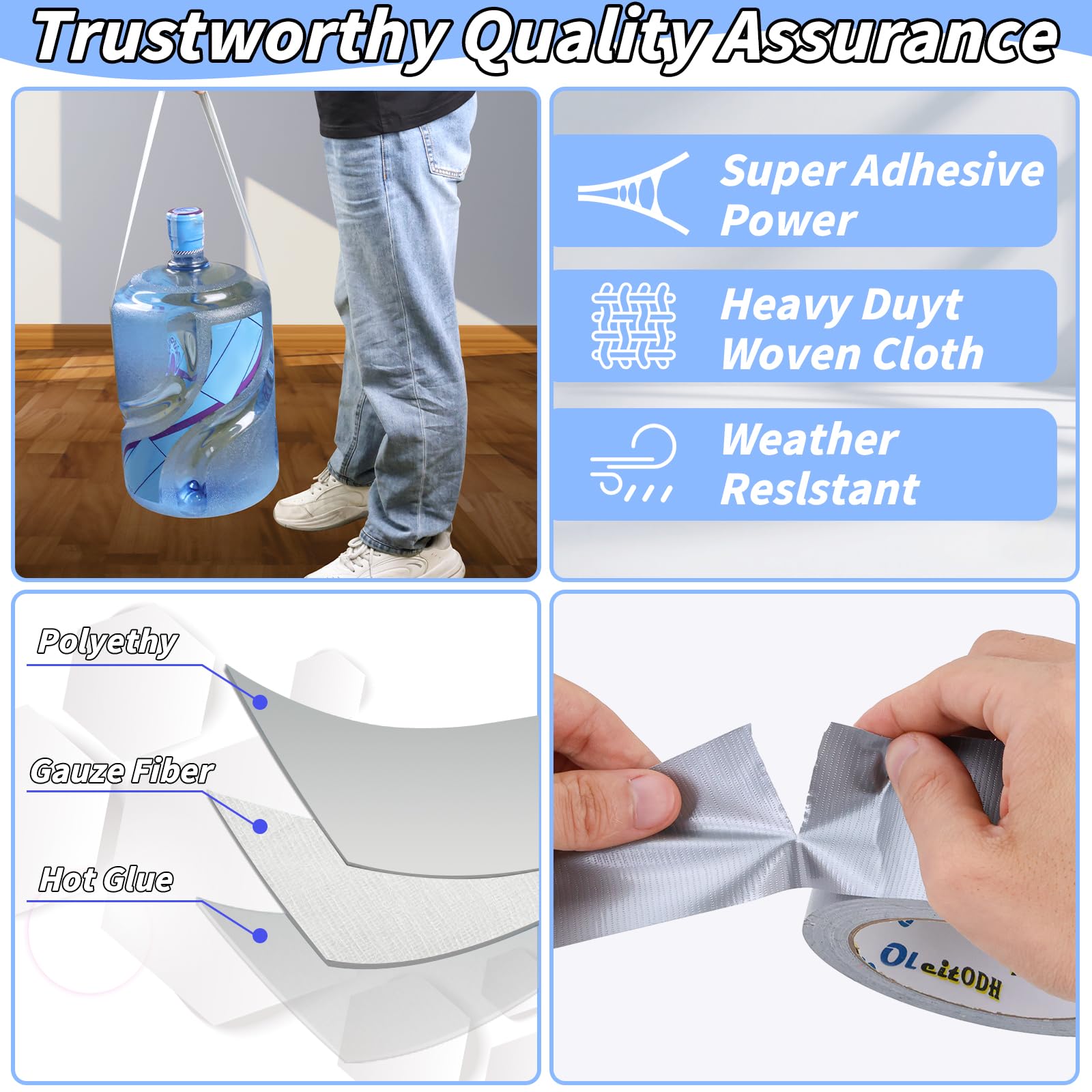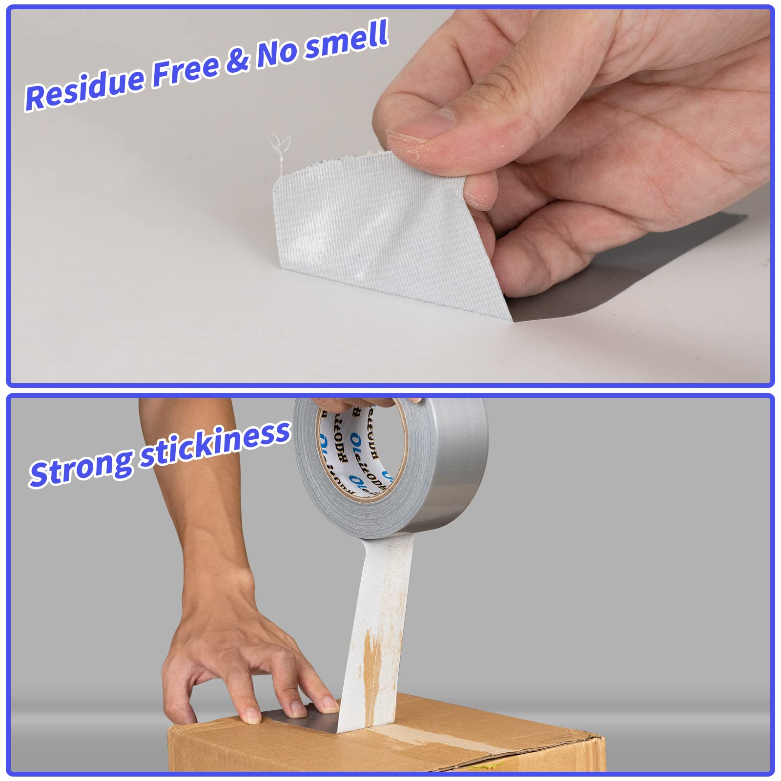 - Waterproof, Residue-Free: All-weather grey duct tape is ideal for sealing, waterproofing, winterizing your home, hanging plastic sheeting, and other emergency repairs. Our max strength duct tape leaves no residue upon removal, without the worry about damaging surfaces. duct tape bulk will adhere to flexible surfaces such as rubber, plastic, and carpet. Easily secures to solid wood, metal, brick, and tile