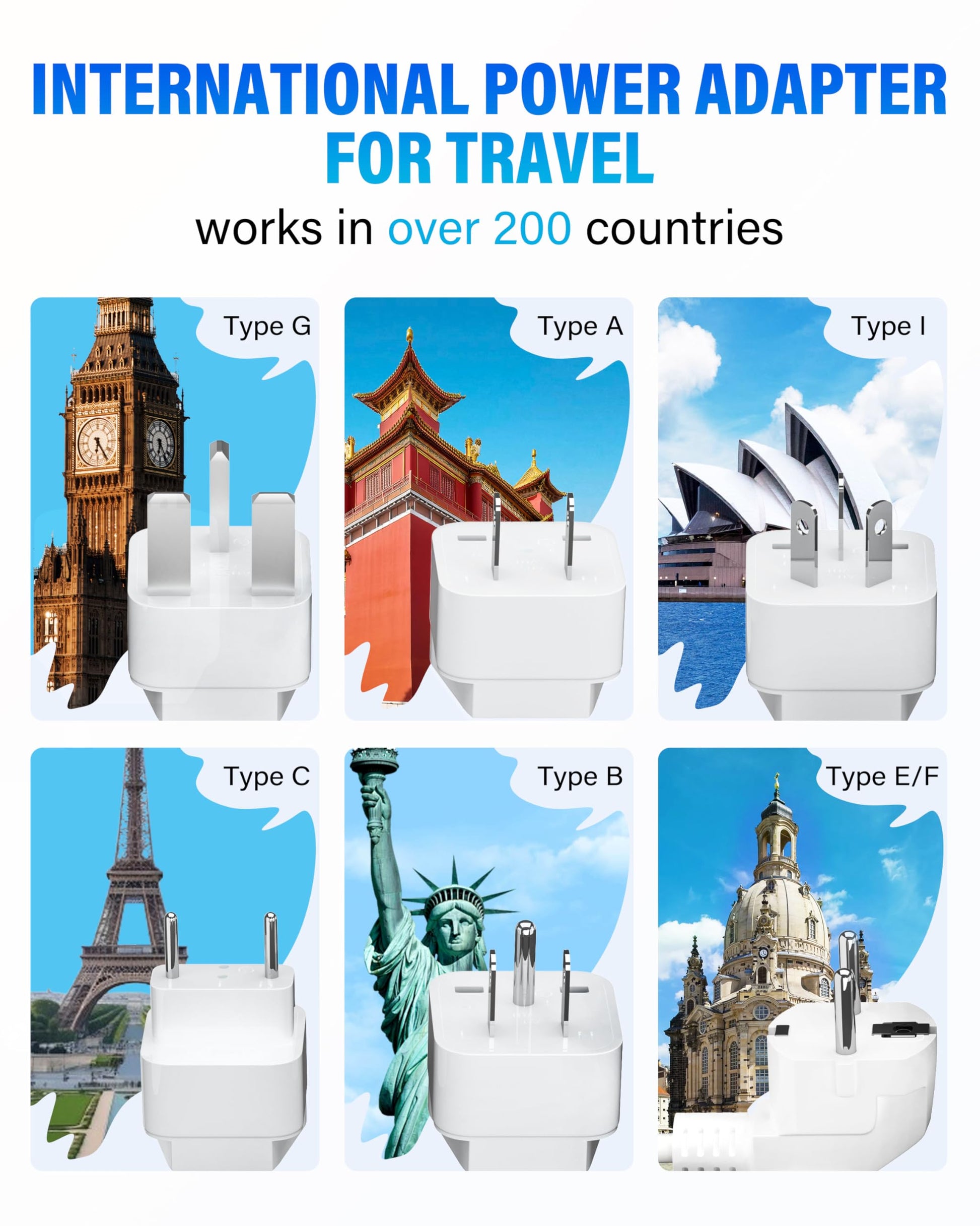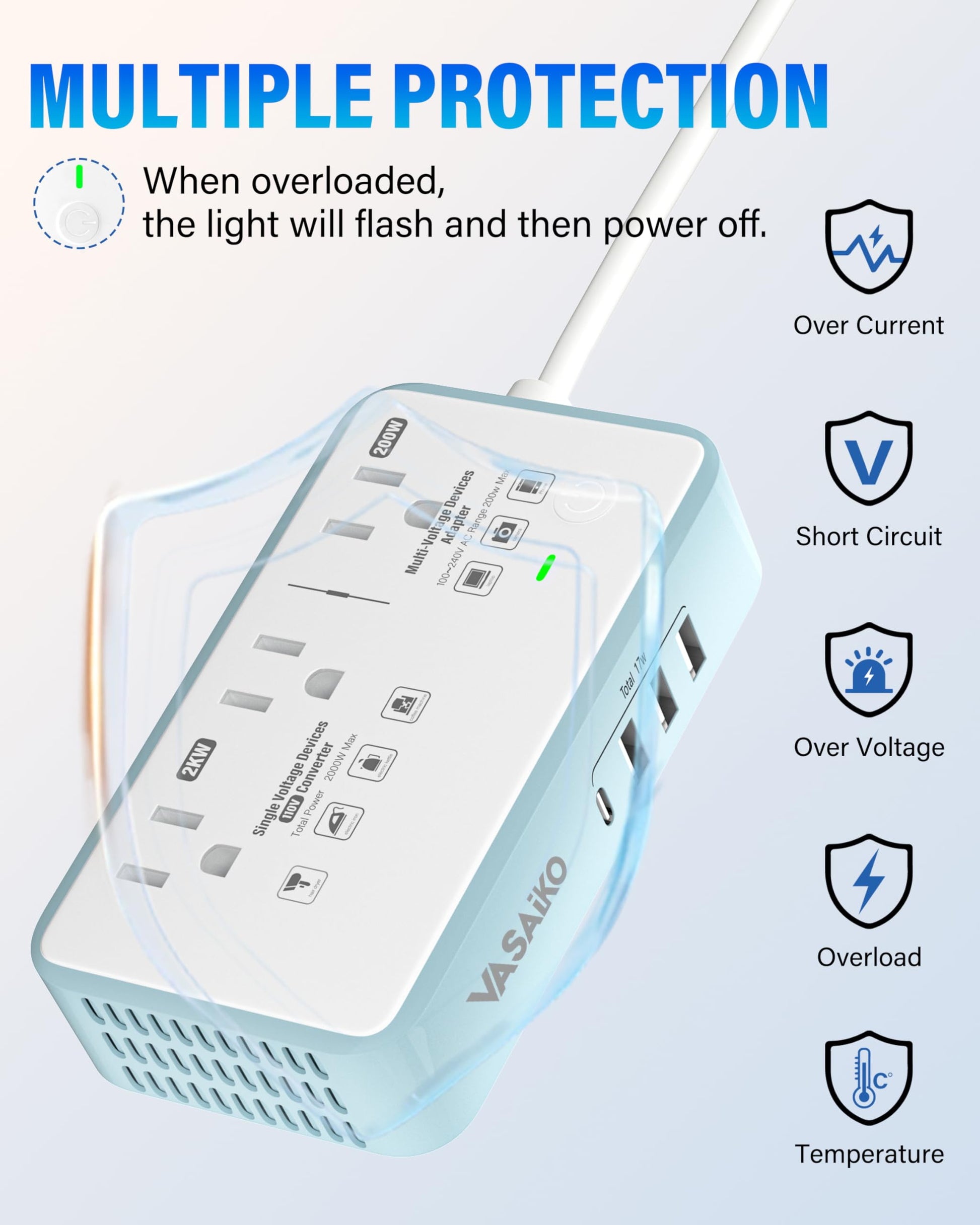 - Safety Design: This converter is compact and lightweight, can be put into luggage and backpacks, convenient to carry around; The universal adapter plug converter offers comprehensive protection against overheating, overcurrent or short-circuit. Equipped with a master switch, one touch power off, no need to plug and unplug frequently