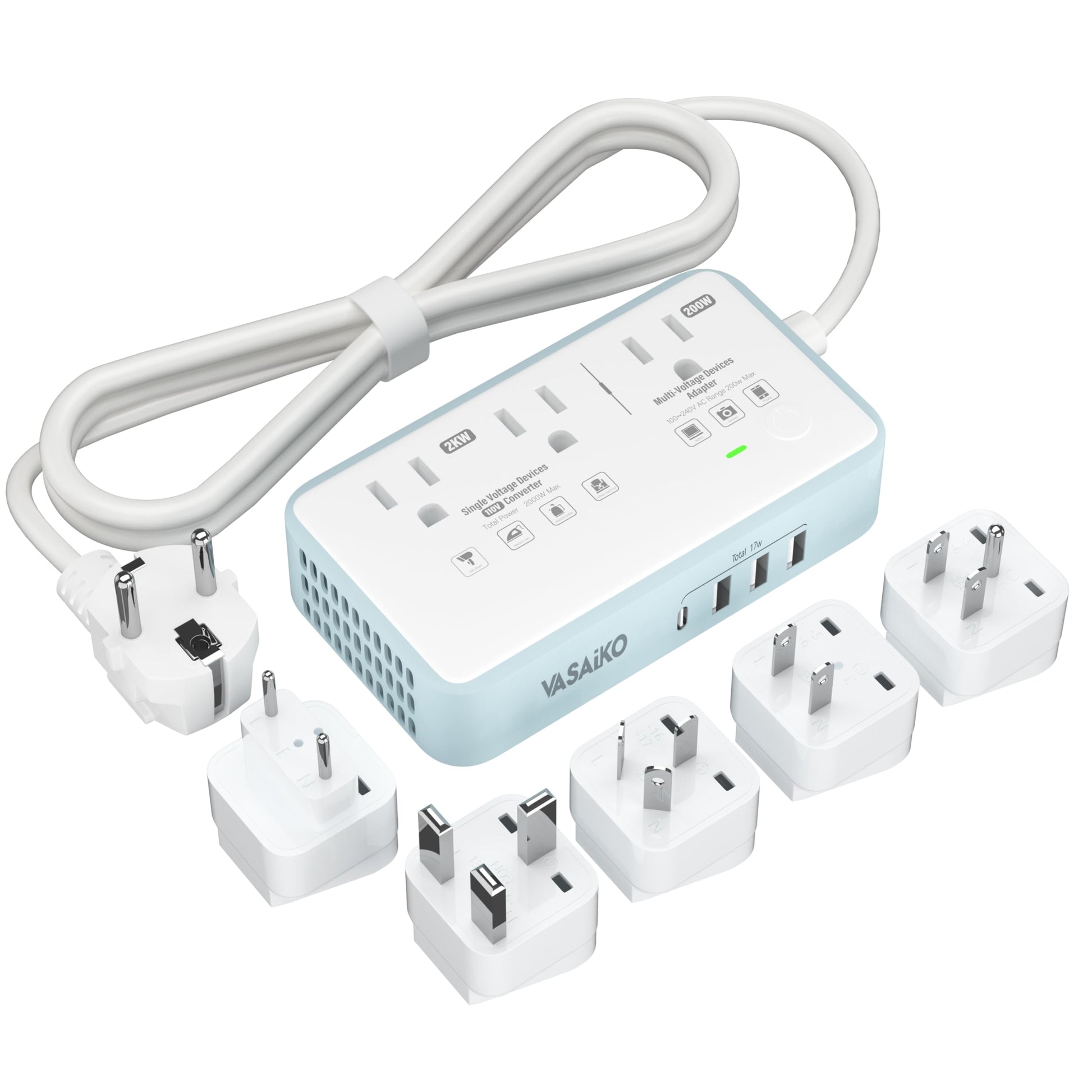 - Voltage Converter US to EU: The 220V to 110V power converter comes with 5 International adapters(EU/AU/US/UK/DE); This is your best partner for travel that fits outlets in more than 200 countries, including North and Central America, UK, Ireland, Cyprus, Malta, Japan, Malaysia, France, Belgium, Slovakia, Tunisia, Germany, Austria, Singapore etc