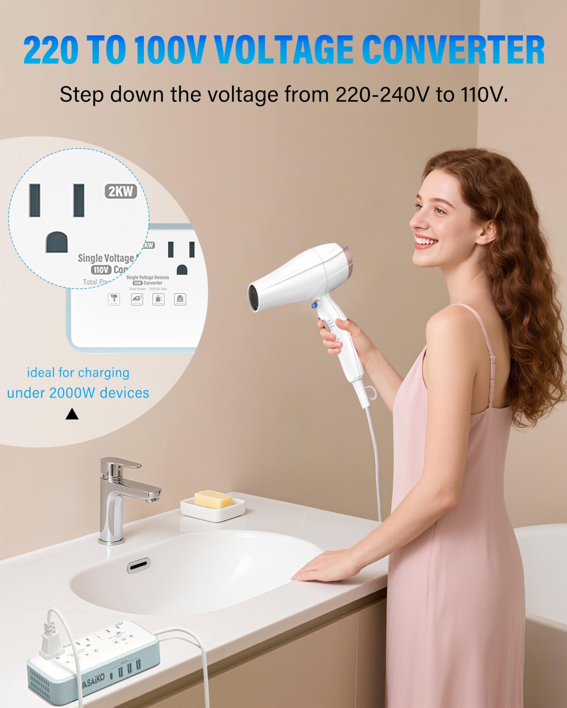 - Different Zones Voltage Converter: the Converter Area supports up to 2000W Total Peak Voltage Conversion for appliances with a voltage of 110V only; The Adapter Area supports up to 200W Peak Voltage Conversion for appliances with a voltage of 100V-240V. Idea for laptop, smartphone, hair dryer, curling iron etc.