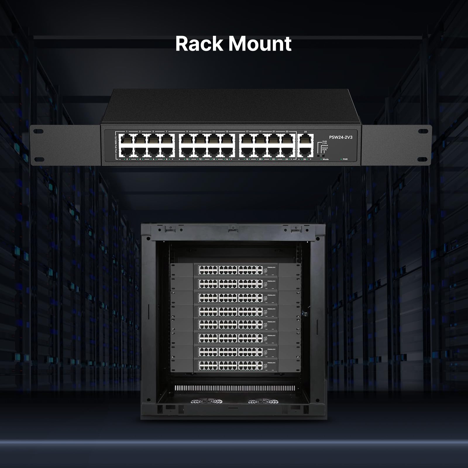 24 Port PoE Switch,10/100Mbps PoE+ Ethernet Switch Unmanaged with 2 Gigabit Uplink Ports, Up to 30W Per Port, Total Budget 280W, 802.3af/at Compliant, Fanless Silent, Rack Mount