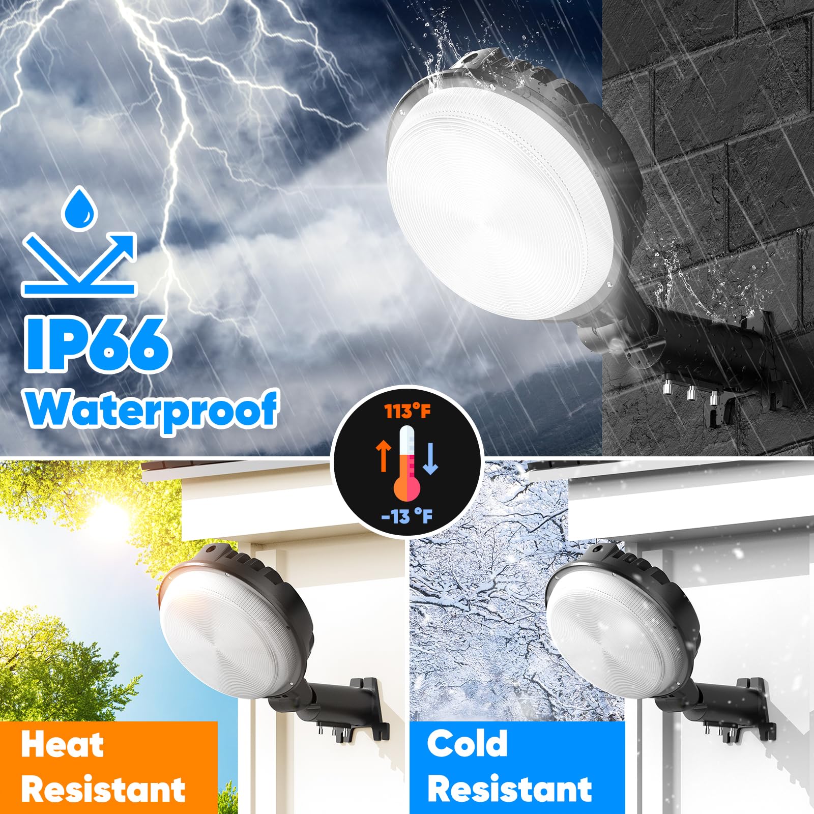 - ๐๐ฃ๐ฒ๐ฒ ๐ช๐ฎ๐๐ฒ๐ฟ๐ฝ๐ฟ๐ผ๐ผ๐ณ & ๐๐ผ๐ป๐ด-๐๐ฒ๐ฟ๐บ ๐จ๐๐ฒ: Compared with other IP65 outdoor LED light that only prevents water drops, our IP66 waterproof photocell barn light pairs with a sealed acrylic cover to prevent dust and heavy rain. The rugged die-cast aluminum housing ensures excellent heat-dissipation and supports a long lifespan over 50000 hours, which serves 19.57 years based on 7hrs daily use. The excellent performance makes it a reliable choice for street, barn, yard, shop and security light