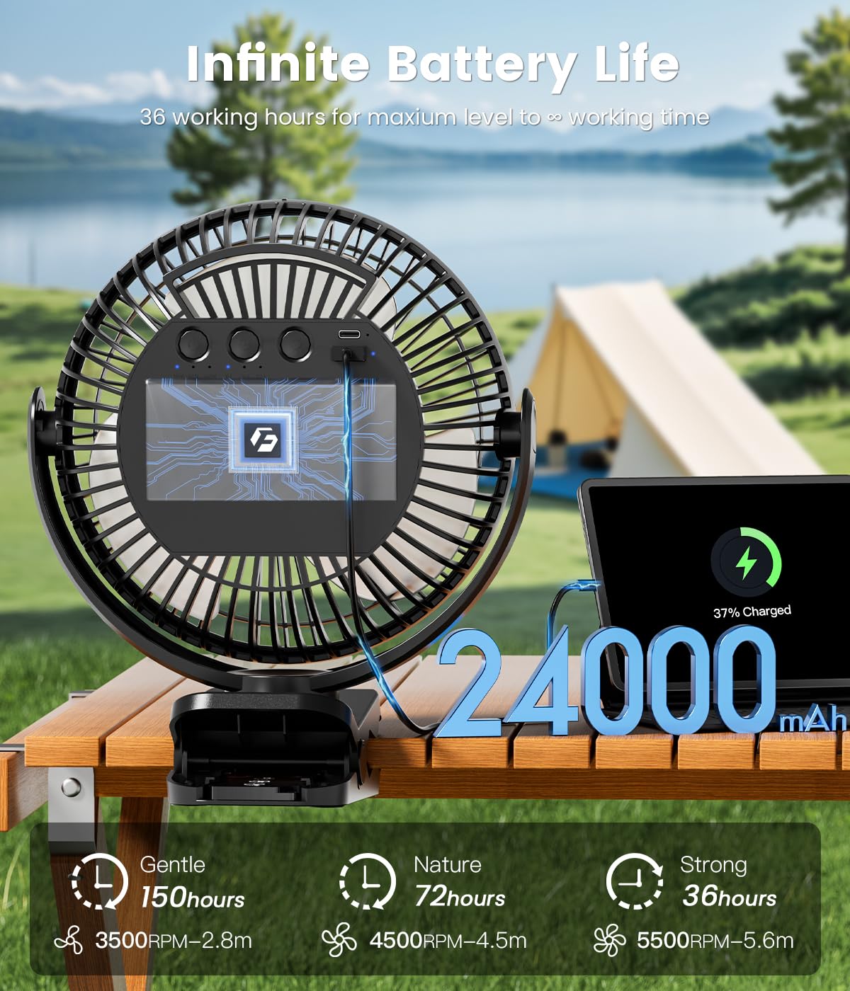 - Immortal Battery Lifetime - This rechargeable clip on fan comes along with a 24000mAh battery that even can last up to 150HOURS when fully charged, which supports 5V-2A(10W) fast charging, which makes the 24000mAh battery can be fully charged within 6 HOURS, so you'll never have to fuss with wires or cords. Type-C cable included