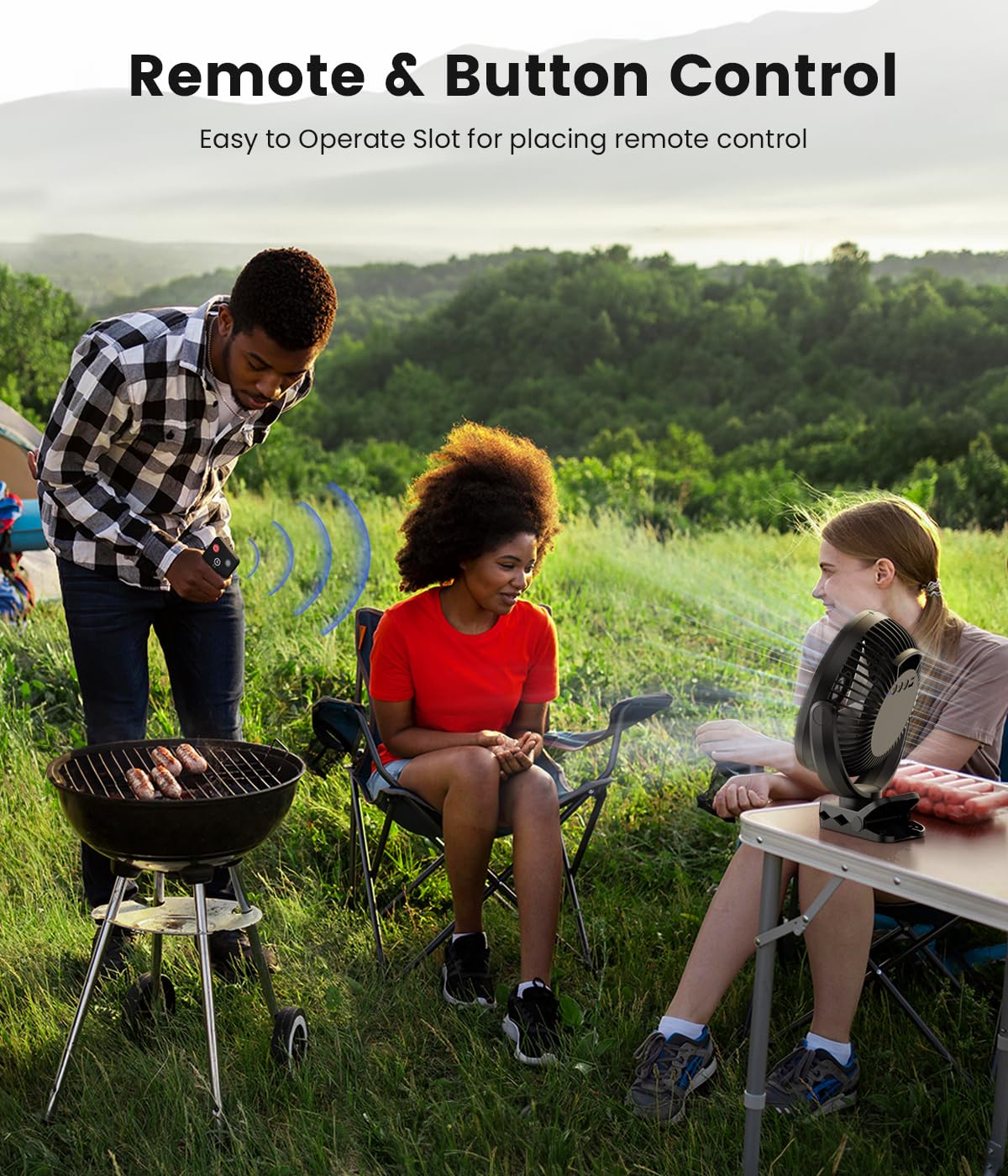 - Bonus Remote & 2 Brightness - Our portable rechargeable fan comes with Wireless Remote Controller max range 15ft, no need to stand or stretch out your arms, so convenient for busy hands. Built-in 9 LED lights with adjustable 2 levels brightness, lighting up in tent or outdoor activities, cooling & safe for hot night