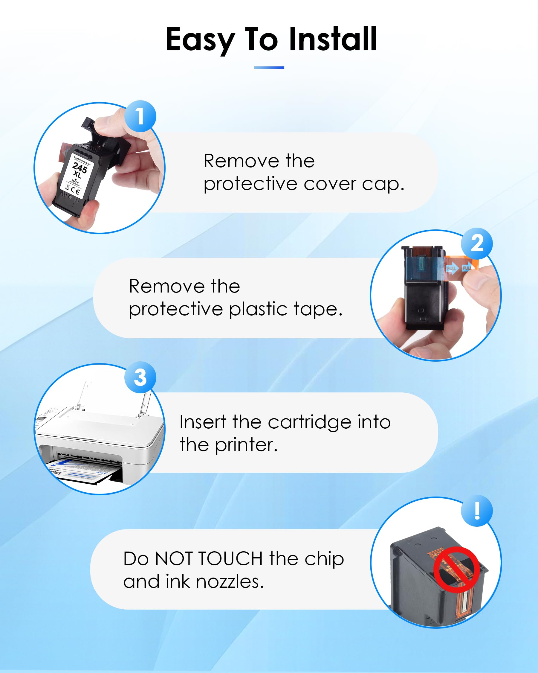 - Dye based ink formulation for beautiful: This 245XL ink cartridge for canon 245xl black ink are filled with dye based ink and equipped with the latest upgrade intelligent chips, which is matched with advanced production technology and strict quality inspection process to ensure the high printing quality of each 245XL ink cartridge. Bring you clear print text