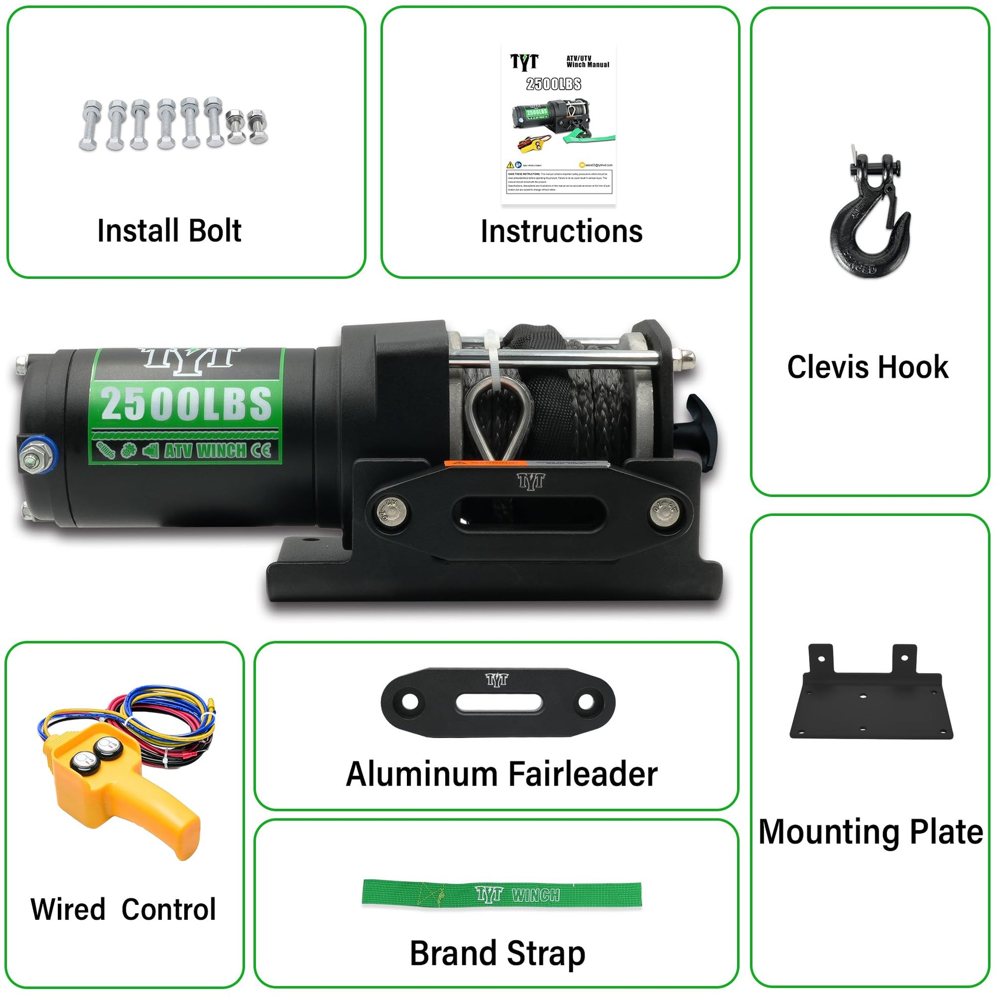 - TYT new 2500 lb. ATV synthetic rope winch kit not only includes all the winch accessories you need, but also has standard mounting dimensions.Fairlead Mounting Pattern: 4 1/4" (108mm); Mounting Plate 2-Hole: 3.10"(78mm )/3"(76mm) . Please ensure compatibility of mounting holes with your winch bracket before purchase.