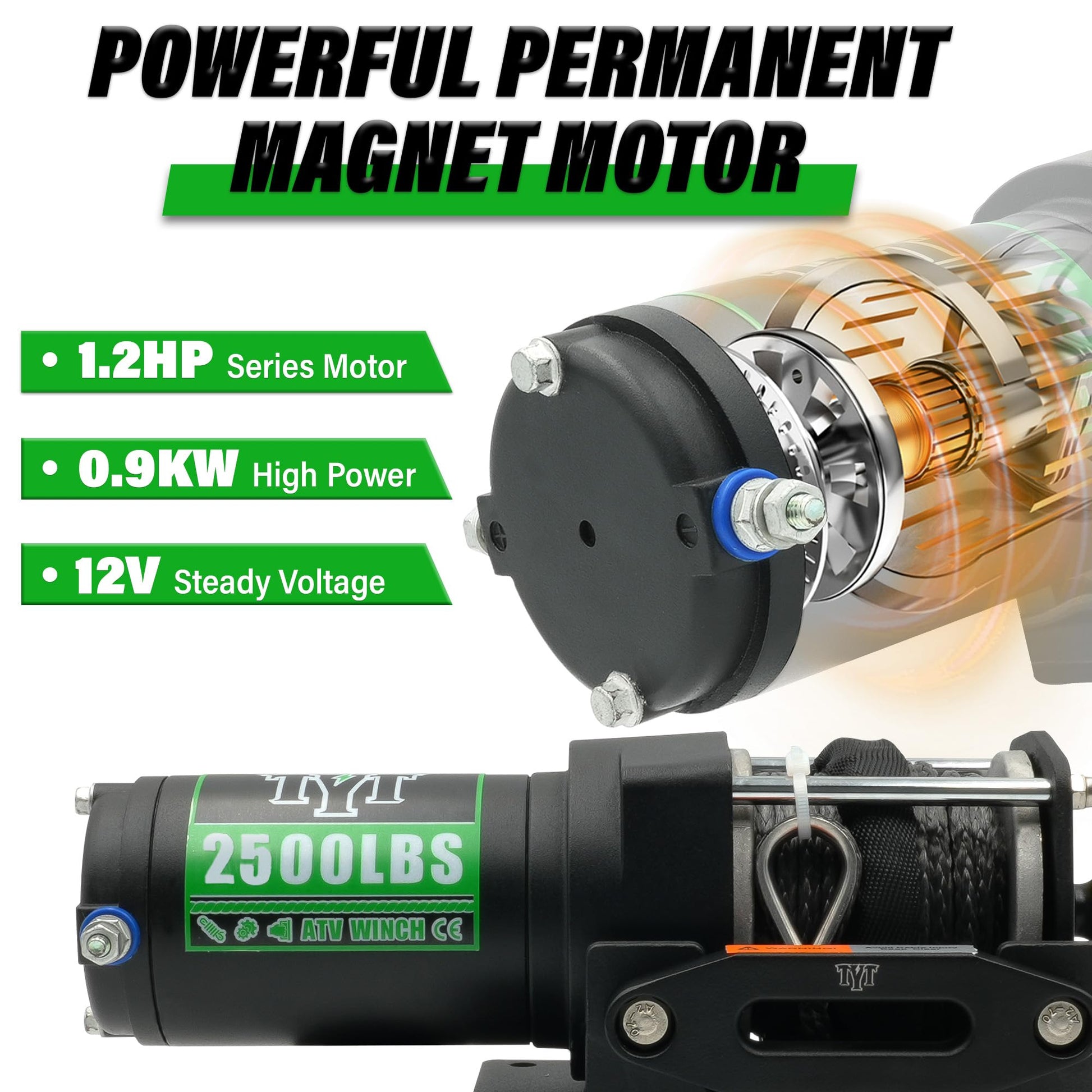 - STABLE PLANETARY GEAR SYSTEM:The 2500 lb. winch powered by a 0.9kw/1.2hp output permanent magnet DC 12V motor, provide more sufficient power and stable output, and reduce the problem of winch damage or winch burning due to insufficient power. Efficiency: 2.9 feet /min when fully loaded, 10.5 feet /min when empty.The winch uses an advanced combined planetary gear system with a gear speed ratio of 153:1, which is higher and faster than other winches, saving time and bringing a better experience.