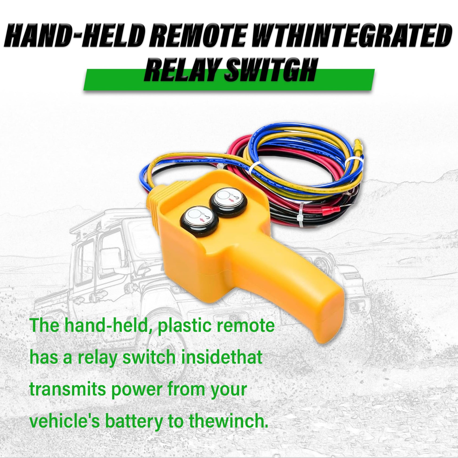 - EASY TO INSTALL AND USE: The minimum cold starting current of this winch is 10A. The winch accessories include a large yellow remote control handle, you only need to connect the power cord of the handle: red to the red terminal of the winch, black to the black terminal of the winch; the other 2 terminals: red to the power supply "+", black to the power supply "- ", by operating the handle switch, you can quickly use the winch, bringing you a new experience.