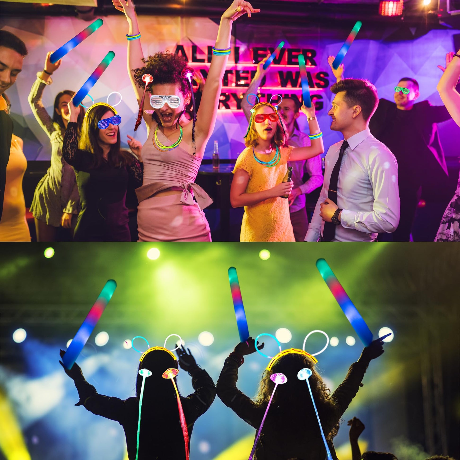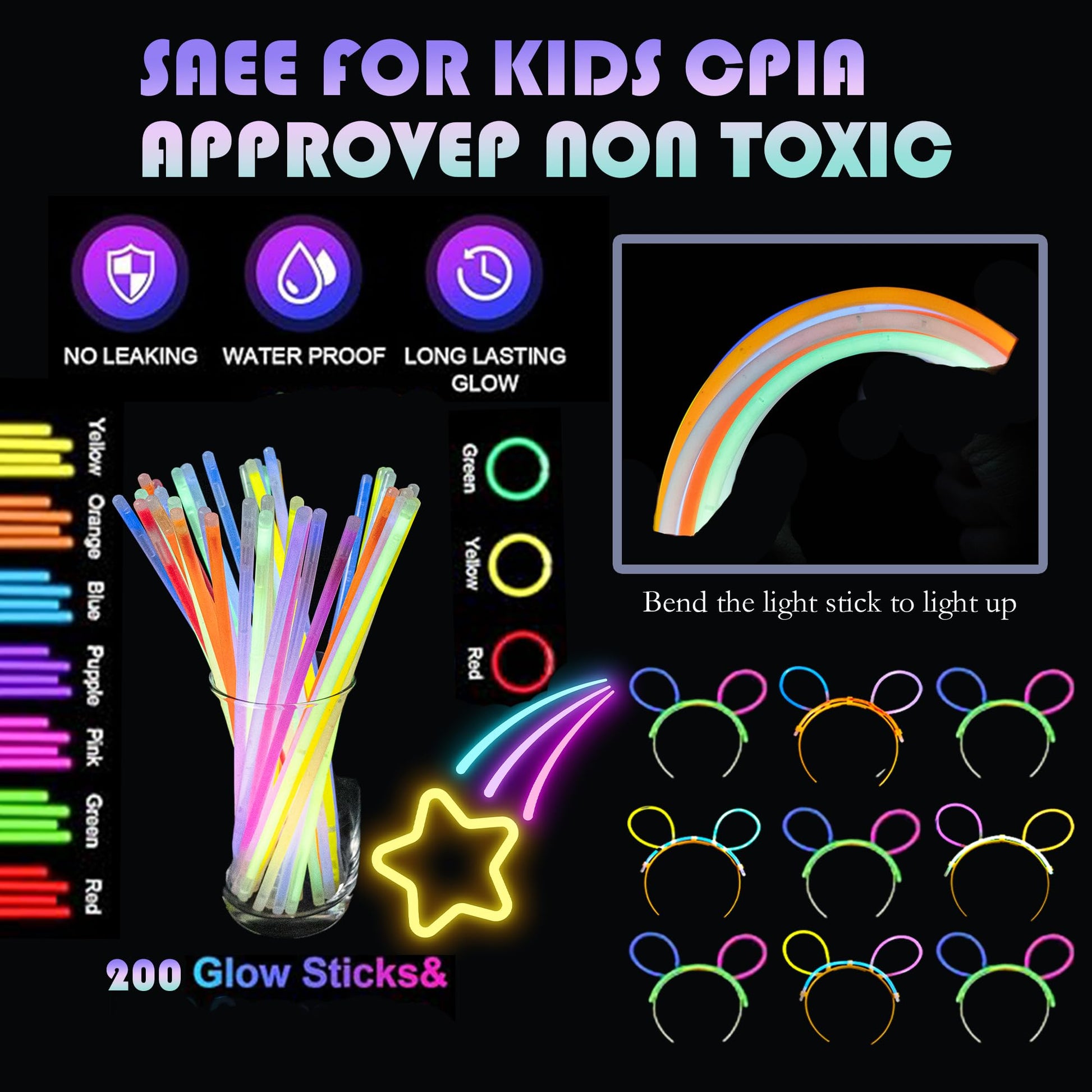 - 🎉Glow In The Dark Party Suppiles Set:This neon bulk toy set includes 24 foam glow sticks, 24 light up glasses, 200 glow sticks, and 12 LED fiber optic hair lights, providing endless fun for both kids and adults as great party gifts.