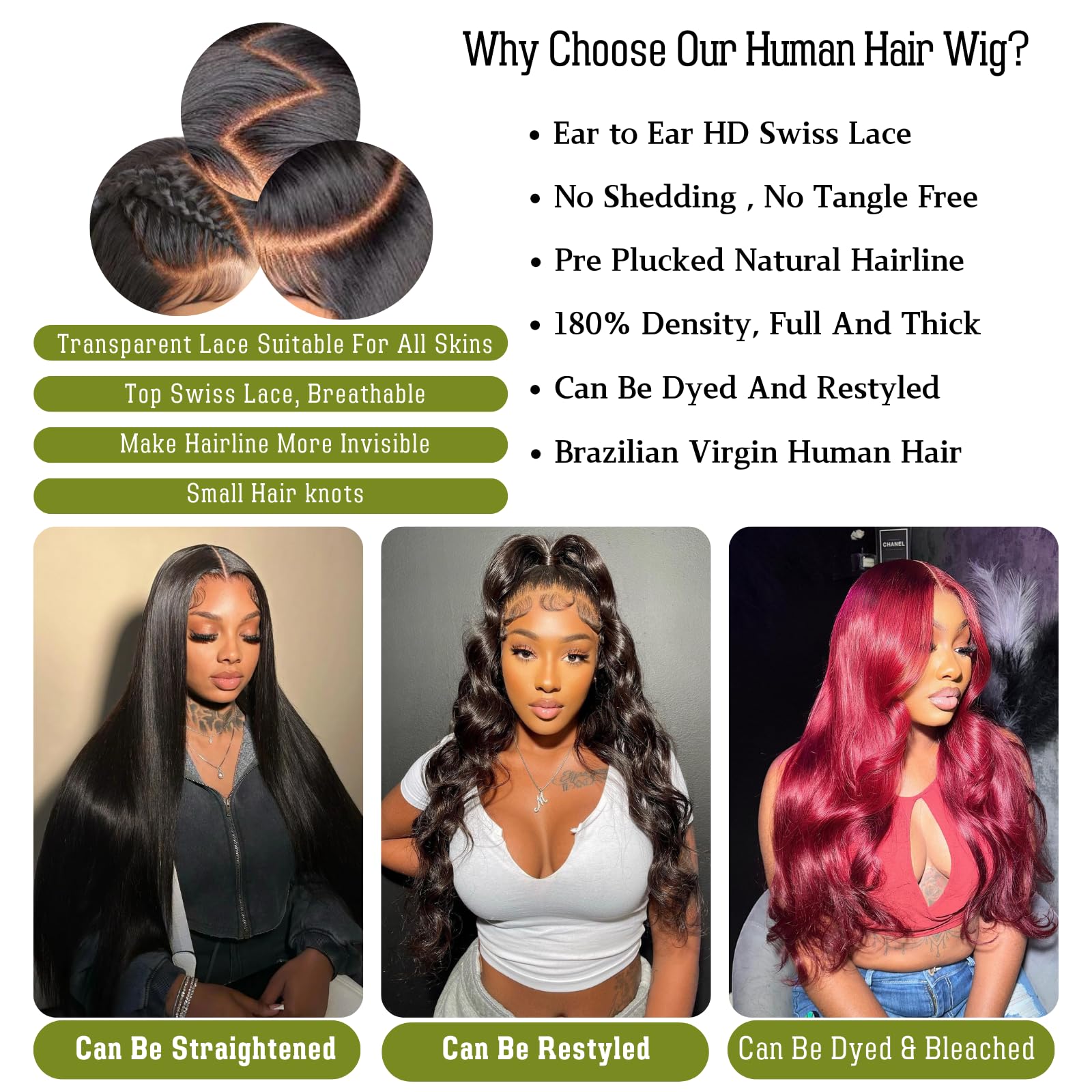 - Wigs Human Hair Advantage: Our Body Wave Wig Frontal Wigs Human Hair, 180% Density, No Smell, Soft, Bouncy, Shedding Free, Tangles Free, True to Length, Full and Thick. Can Be Dyed&Bleached, Straightened and Restyled, Can Be Side Part, Middle Part, High Ponytail& Bun, Styled As You Like