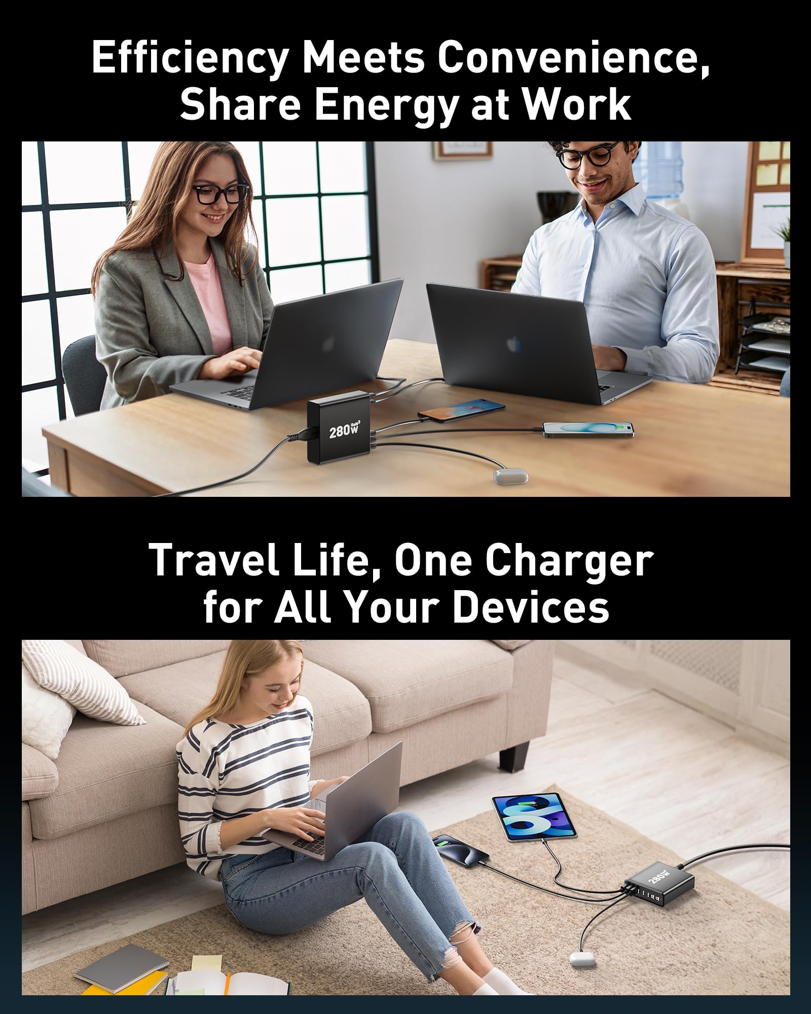 280W USB C Charger Block, 8-Port USB C Charging Station GaN III PD 65W Laptop Charger Adapter Compatible with MacBookPro/Air,DELL,iPad,Portable Charging Station for iPhone,Samsung Galaxy (Black)