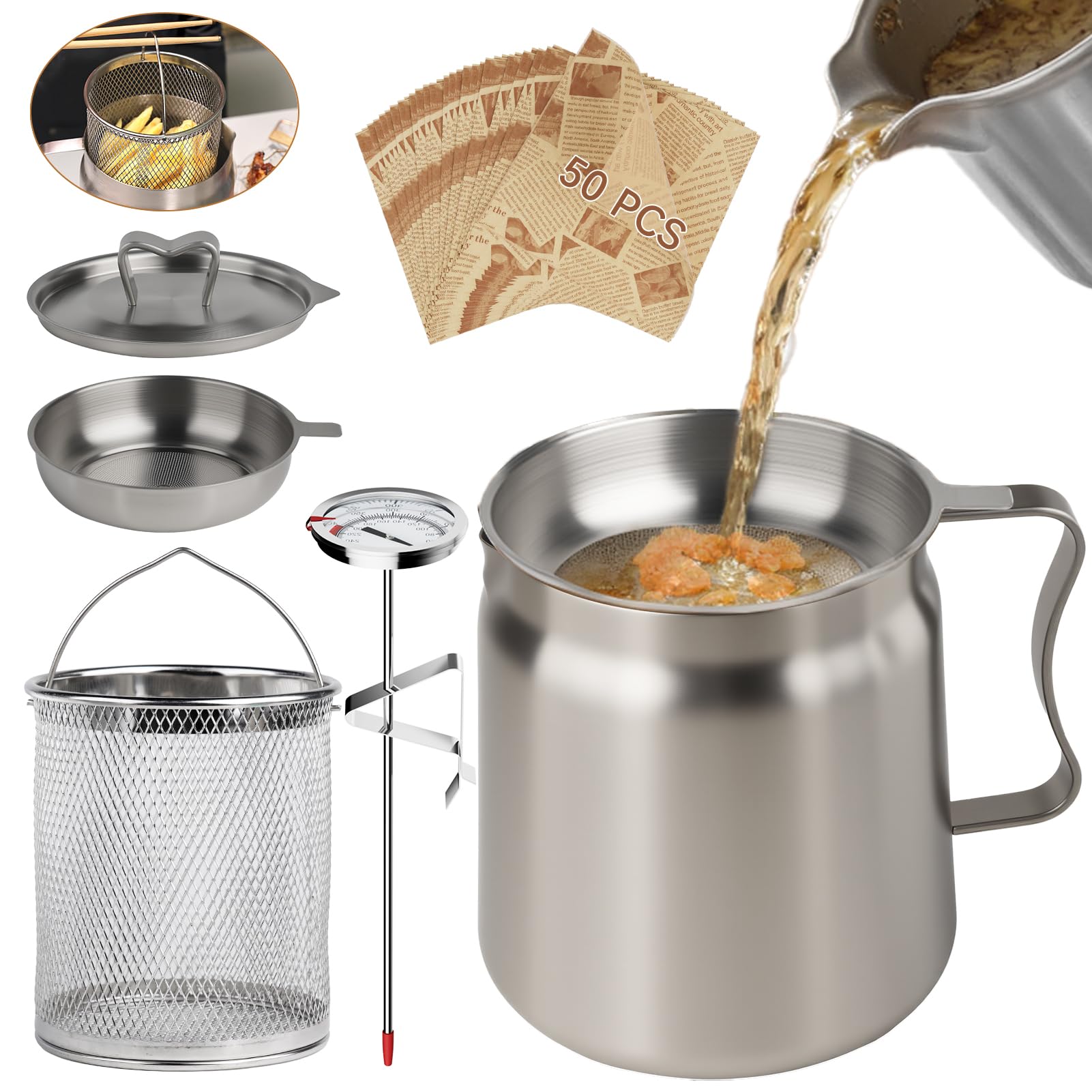 - 【Large Capacity Oil Filter Pot Set】 This bacon grease saver is made of high-quality food-grade heavy-duty 304 stainless steel, 2L/68oz Large Capacity,Includes pro-grade meat thermometer (accuracy ±2°F) + 50 food-safe wax papers + mini fry basket - no more guessing oil temperatures or scrambling for storage solutions after family fry nights.
