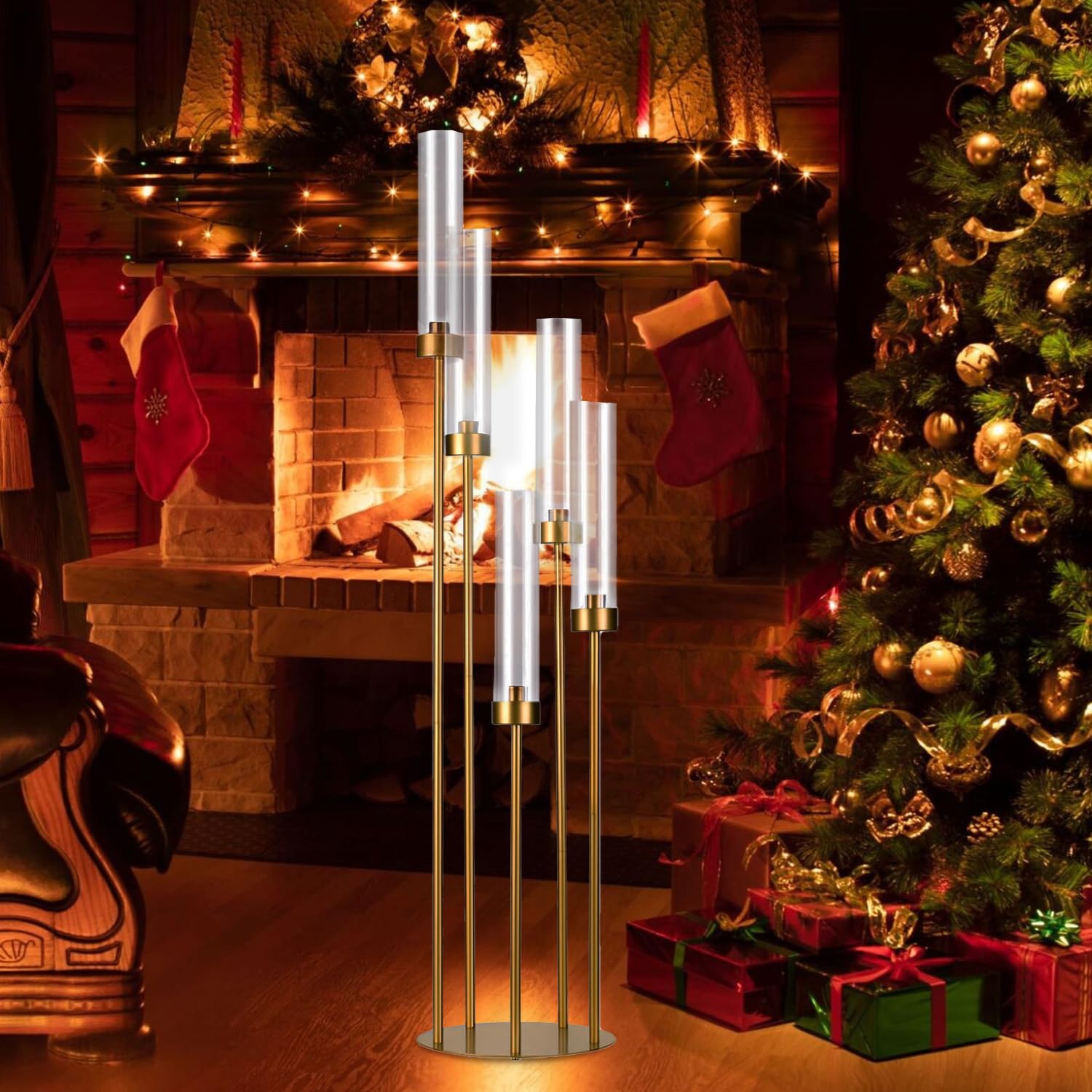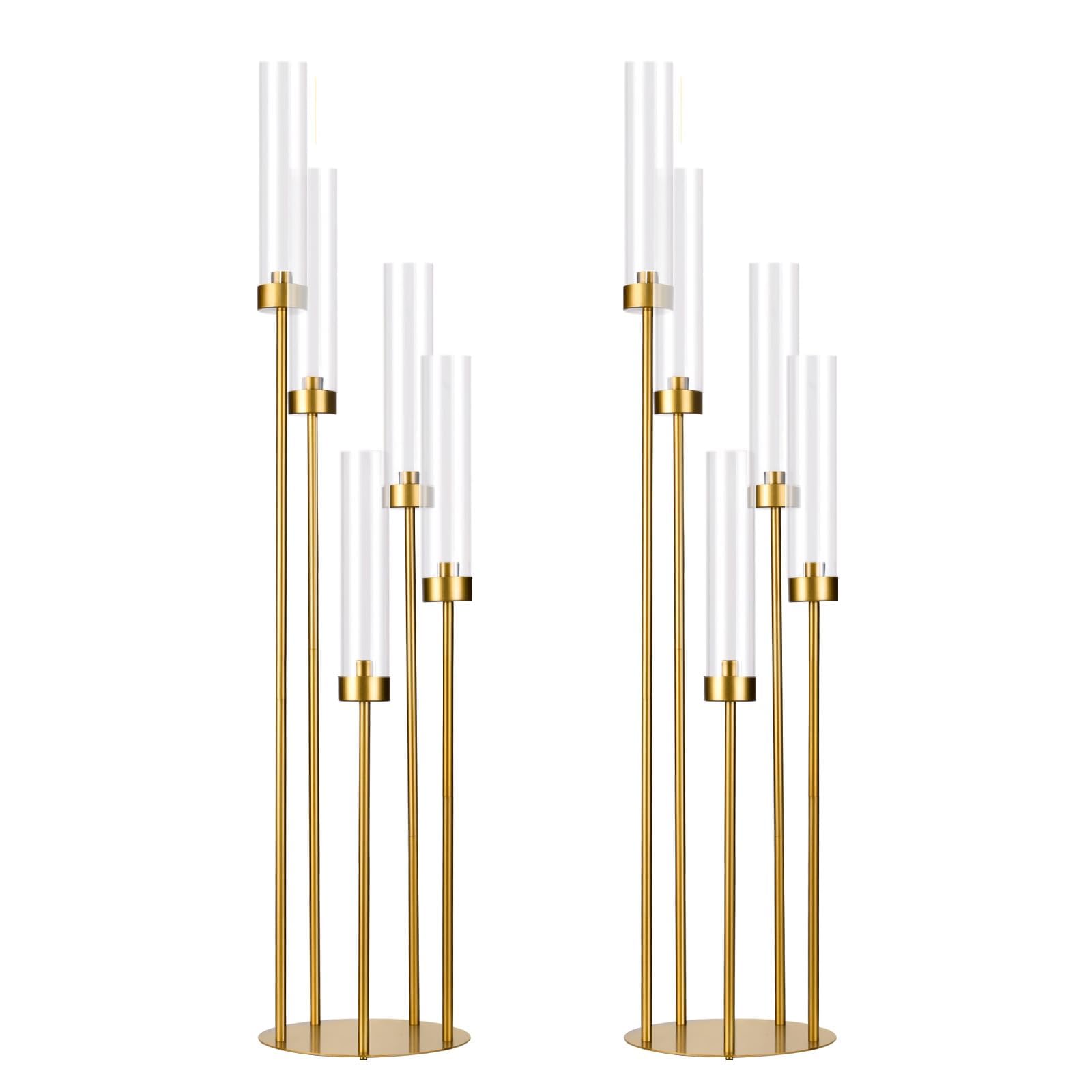 - 5 Arm Floor Candelabra:The total height of this floor candlestick is 39.4 inches/100 cm, and the height of the 5-arm high candlestick is 23.6/27.5/31.5/35.4/39.4 inches, including the height of the lampshade.Each gold candlestick holder includes 5 removable acrylic lampshades, with a height of 8.9 inches and a diameter of 2 inches (excluding candles); floor candle holder high can meet the decoration needs of weddings, restaurants, parties, and various scenes.