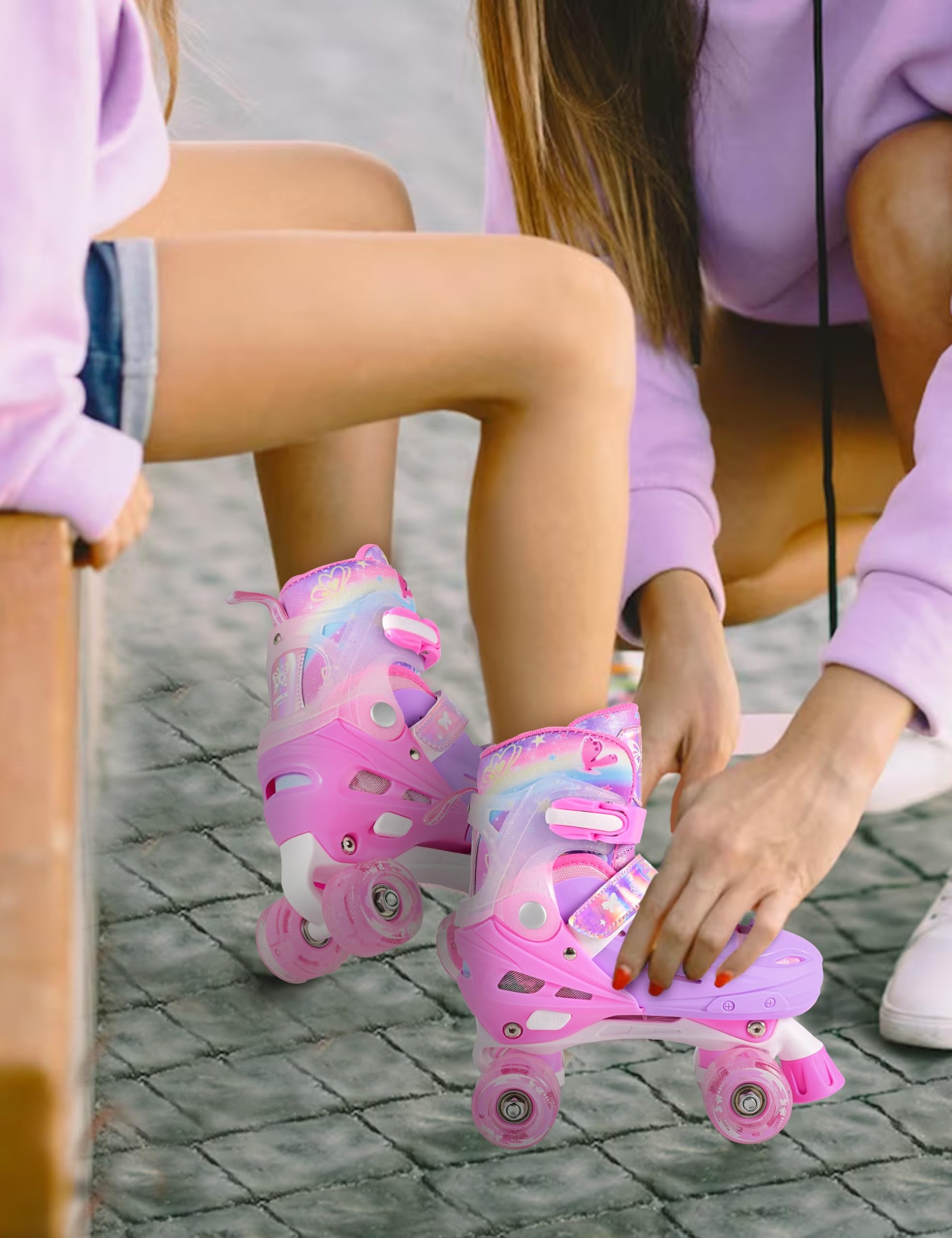 - 4 ADJUSTABLE SIZES: Fits growing feet with 4 size options. Easy-to-adjust buttons for quick resizing. Available in Small, Medium, and Large. Perfect for roller skates girls ages 5-8 8-12. Check size chart for the perfect fit