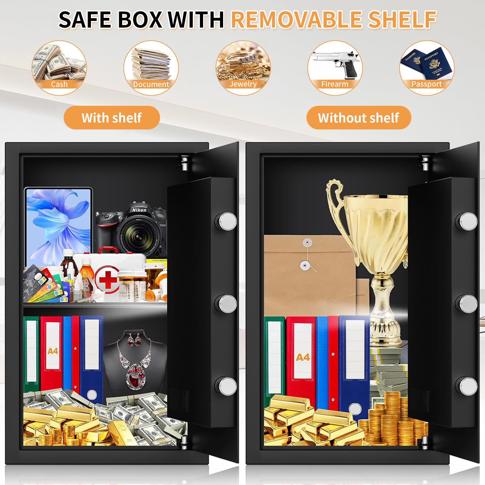 - 【REMOVABLE SHELF AND LED LIGHT】The removable shelf can help you organize important items easily, and you can take it in or take it out according to your needs. The 3.0 cubic capacity safe can meet your daily storage needs and is very suitable for protecting your valuables and privacy, such as pistol, documents, passport, jewelry and so on