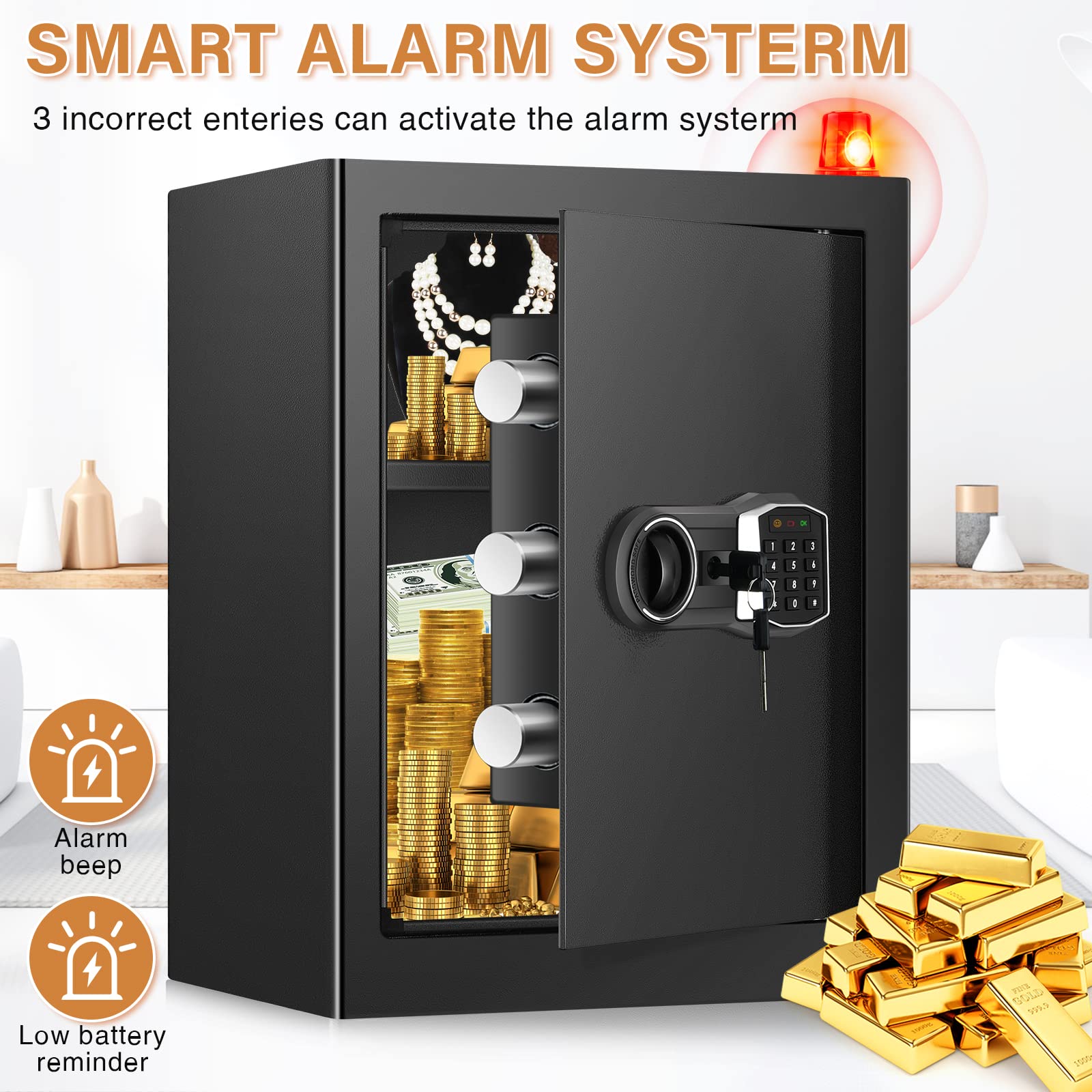 - DUAL SECURITY ALARM: Our safe comes with a dual alarm system to prevent password guessing, if you enter the wrong password 3 times in a row, the system will lock for 20 seconds; if you enter the wrong password 6 times in a row, it will lock for 5 minutes. It can effectively deter unauthorized access and secures valuables away from kids