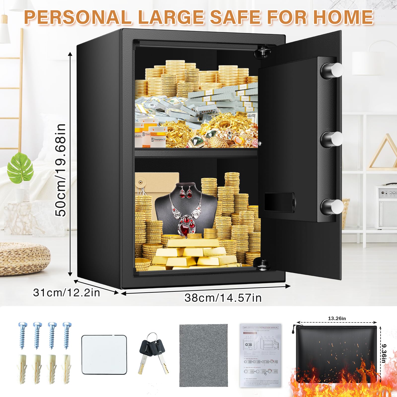 - LARGE SAFE BOX FOR HOME USE: Our home safe has a smart capacity of 3.3 Cubic, it is not only great for keeping items from prying eyes in your home such as sensitive documents, electronic storage drives, spare credit cards, medicine etc, but also can protect your valuables from theft, children or nosey visitors