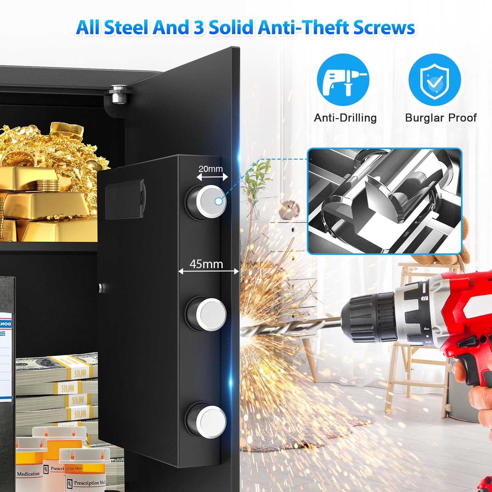 - 【STURDY & PRY-PROOF HOME SECURITY SAFE BOX】The document safe is made of solid cold rolled steel integrally welded with recessed pry-resistant door, and comes with 3 enhanced steel locking bolts, durable steel construction to keep your property safe. Scratch and stain resistant powder coating protects the safe from rust and damage.