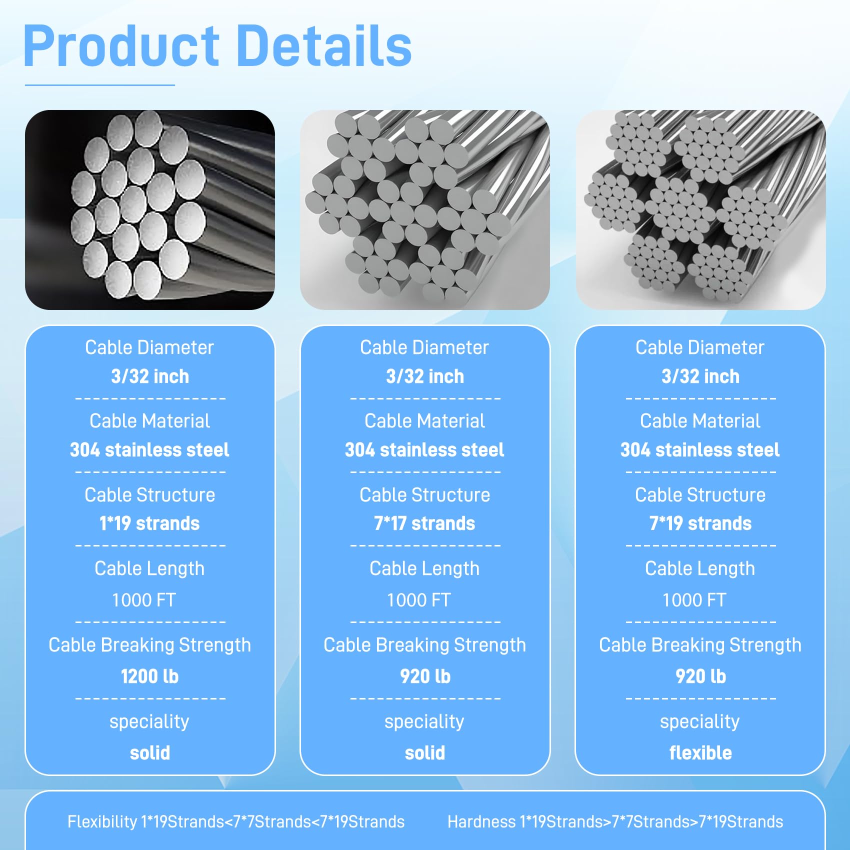- Superior Quality: This 3/32 inch stainless steel wire rope is constructed using high-grade 304 stainless steel material, ensuring exceptional durability and resistance to corrosion. Each 3/32 wire rope consists of 7 strands with 7 wires per strand, providing a robust structure capable of withstanding up to 920 pounds of tension.
