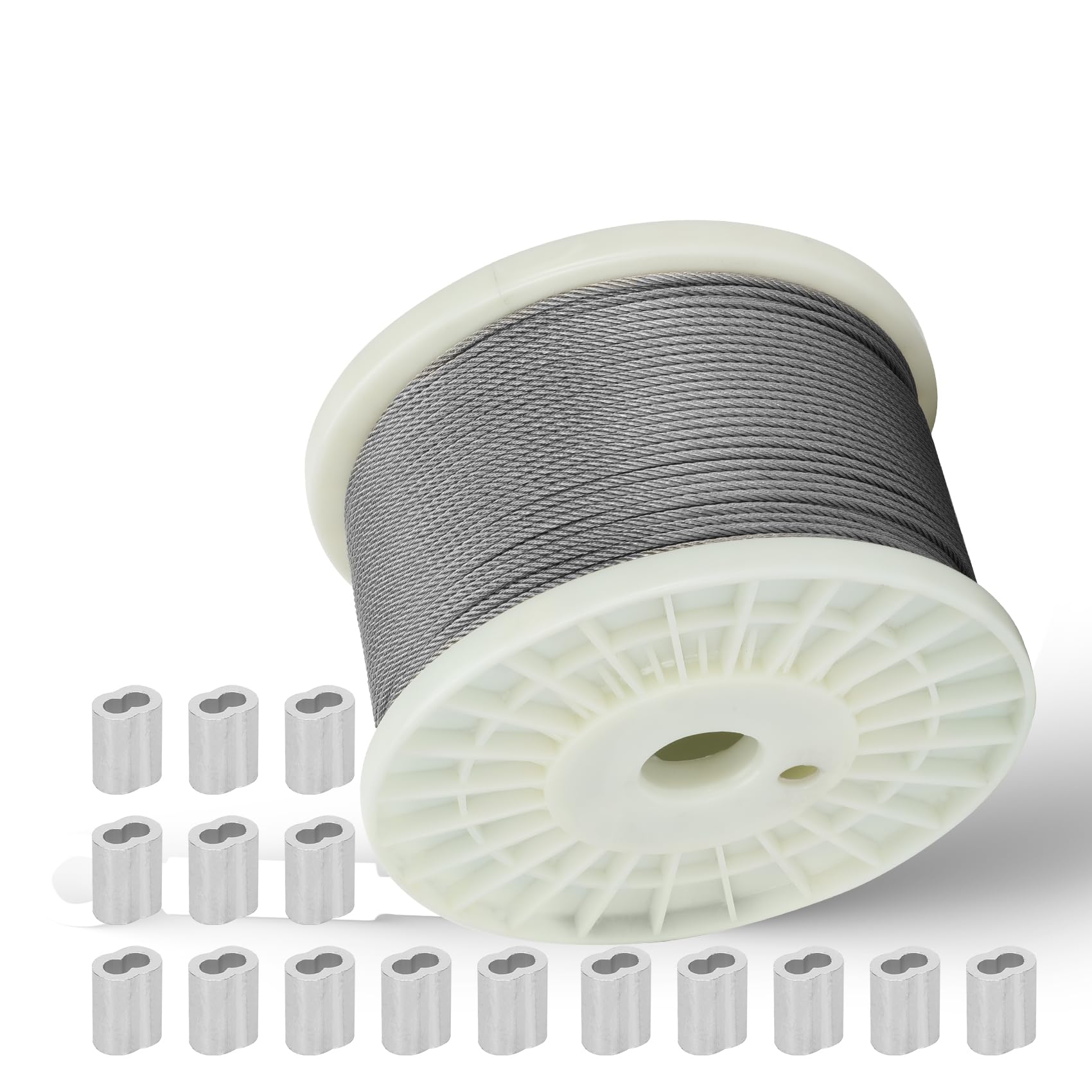 3/32 in Stainless Steel Cable Wire Rope 1000ft, 7x7 Strands Stainless Steel Aircraft Cable, for Deck Railing, String Light Hanging, Marine Rigging, Garden Wire with 300 M2.5 Crimping Loops