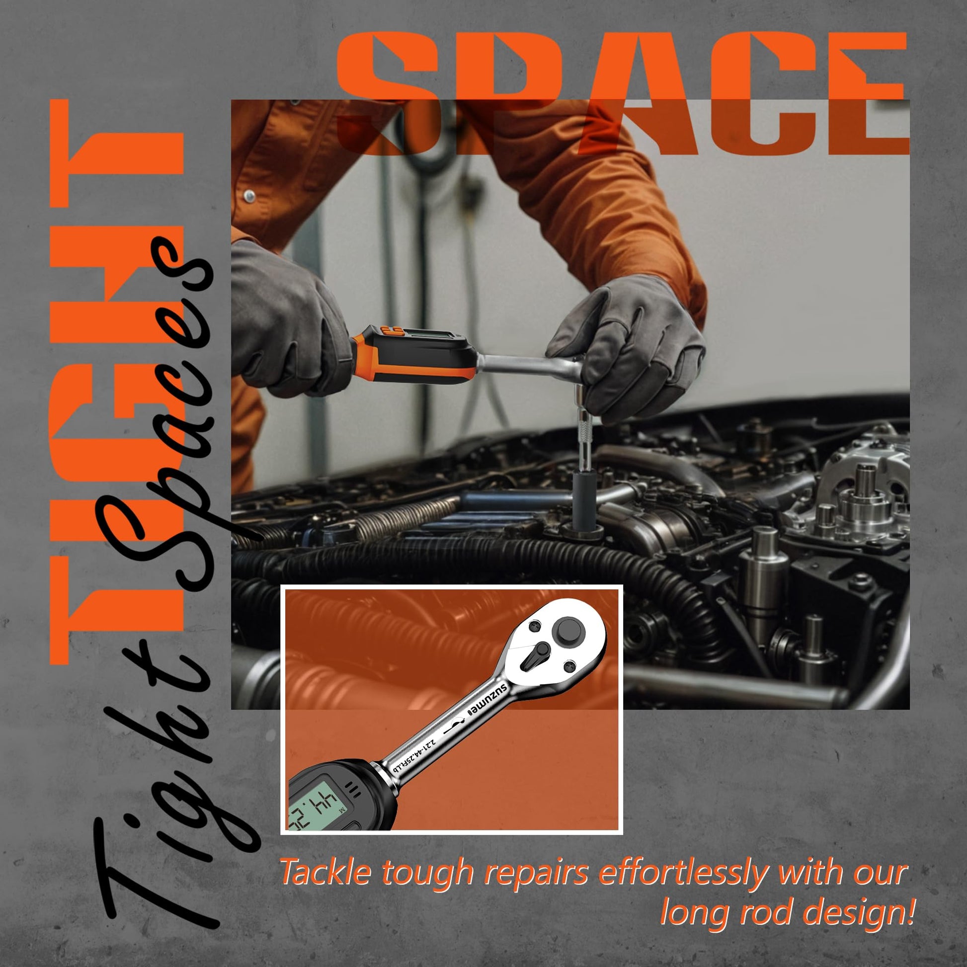 - [Torque Made Effortless] We know you work hard, so we designed this 3/8 digital torque wrench with a long rod to help you get the job done without straining—no more awkward yoga poses! A quick press of the backlight button lights up the display for easy reading, even in bright sunlight. Plus, hold the button for 3 seconds to lock the screen and avoid surprises—because the only surprises you want are in your toolbox! We’ve got your back!