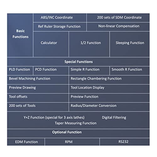 - The 3 Axis digital readout display meter system is equipped with a variety of intelligent functions:MM/INCH, SDM 200 sets memory, bevel processing, power-off memory, circumference drilling, oblique line drilling, 1/2 centering,Axis sunmming functuon etc. Extra RPM function,Also a calculator is equipped for more convenient usage