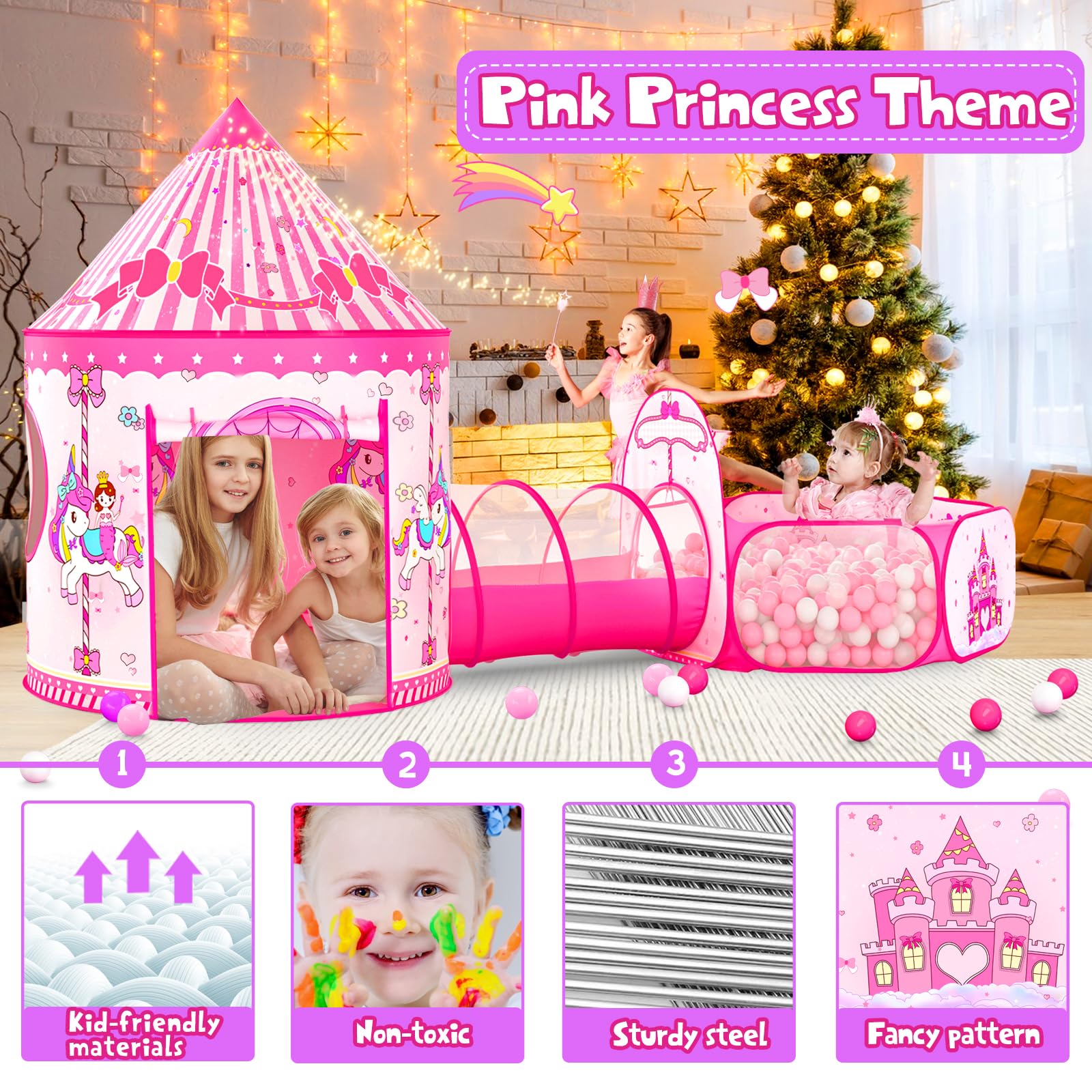 - 💗3 in 1 Pop up Kid Tent: The 3Pcs girls toy tent is combined with a kids ball pit, a crawling tunnel, and a castle tent. Each play house tent can be used together or separately easily. This Combination of toddler tents can exercise kid's hands-on and crawling ability, and inspire intelligence. Throwing the balls into the basket hoop encourages kids physical play and stimulates their imaginations at any time.