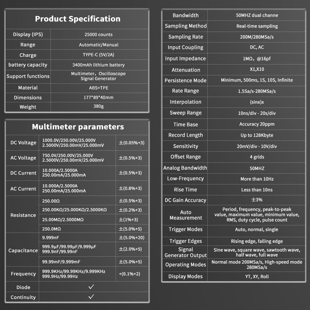 3 in 1 Handheld Oscilloscope Automotive Dual Channel 50MHz with Digital Multimeter and Signal Generator