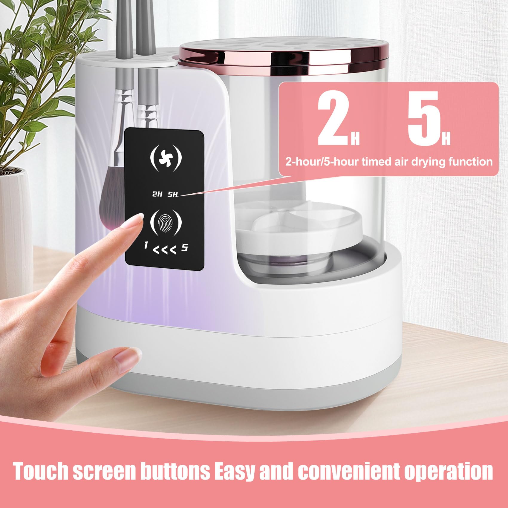 - Timing design: 1. Makeup brush cleaning function cleaning time for five minutes, five minutes to the end of the automatic stop cleaning (if not washed for five minutes can be repeated to open the cleaning) 2. Makeup Brush Dryer is divided into 2-hour timer and 5-hour timer drying, set the time to automatically stop drying (Note: Normal rotating noise at startup. It is recommended that the summer drying set to 2 hours, winter drying set to 5 hours)