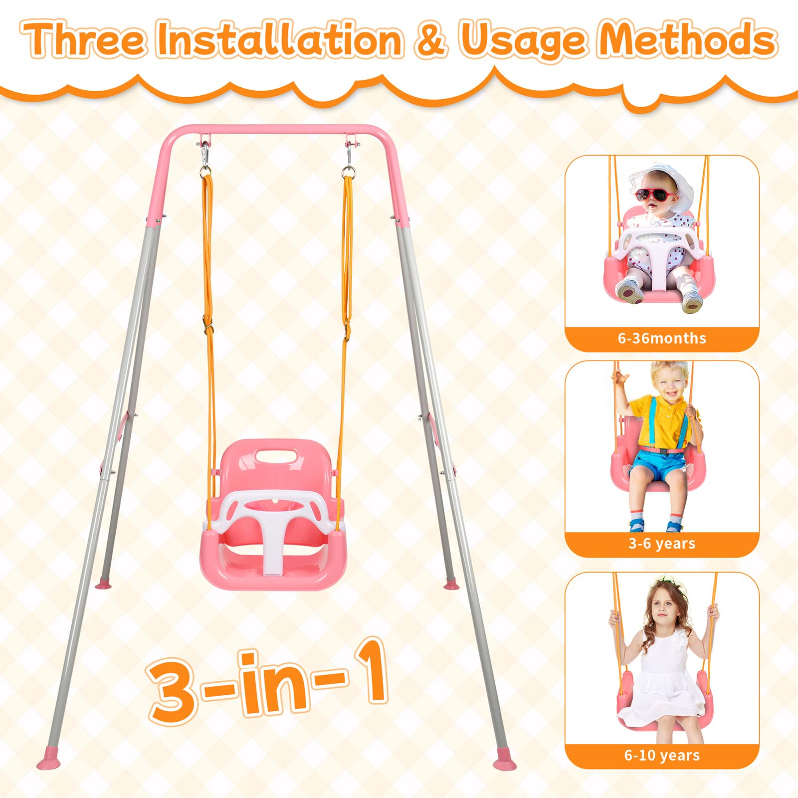 - 【3-in-1 Toddler Swing Set】Our swing seat uses a removable 3-in-1 design. Swing set with removable seat and adjustable rope for swing set fits children 6 months to 10 years old. A toddler swing set can give your child a wonderful time at different ages. Note: Always supervise toddlers during play