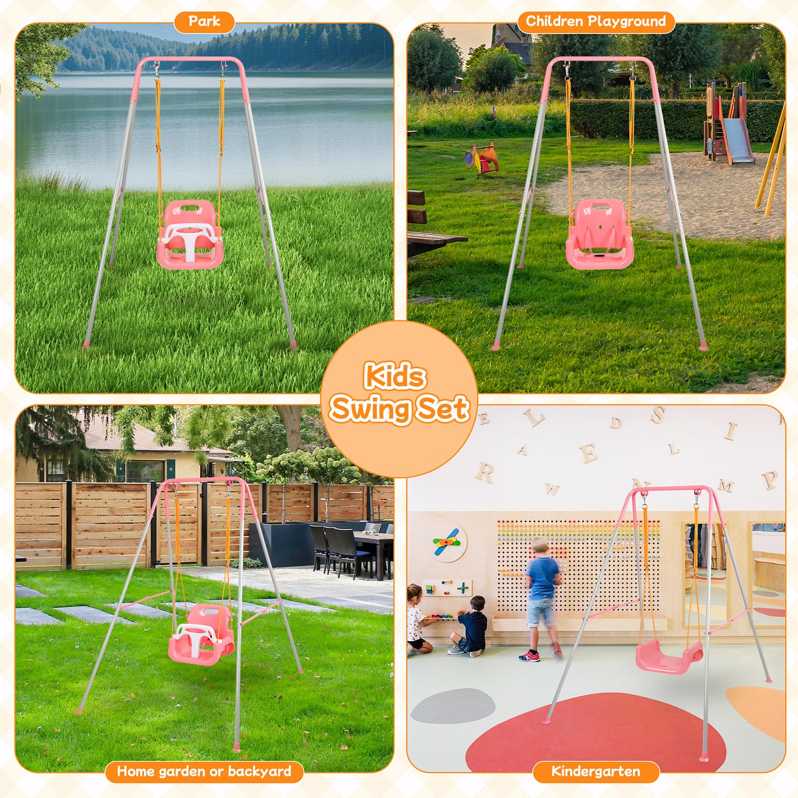 - 【Indoor and Outdoor】This toddler swing set comes with an independent, sturdy, and stable swing frame. Whether you prefer the living room, the backyard, the park, or the playground, this Kids Swing Set can be played anywhere you like! It can be easily folded and stored against the wall when not in use to save space