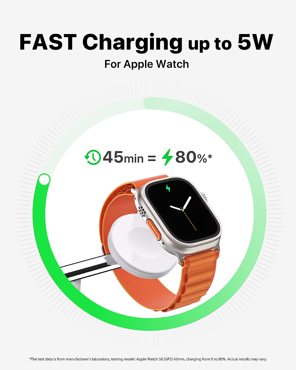 - Fast Charging for Apple Watch: Up to 5W Apple Watch charger. Charge Apple Watch 9 up to 80% in just 45 min—ideal for a fast charge before bed, ensuring it's ready to monitor your sleep all night