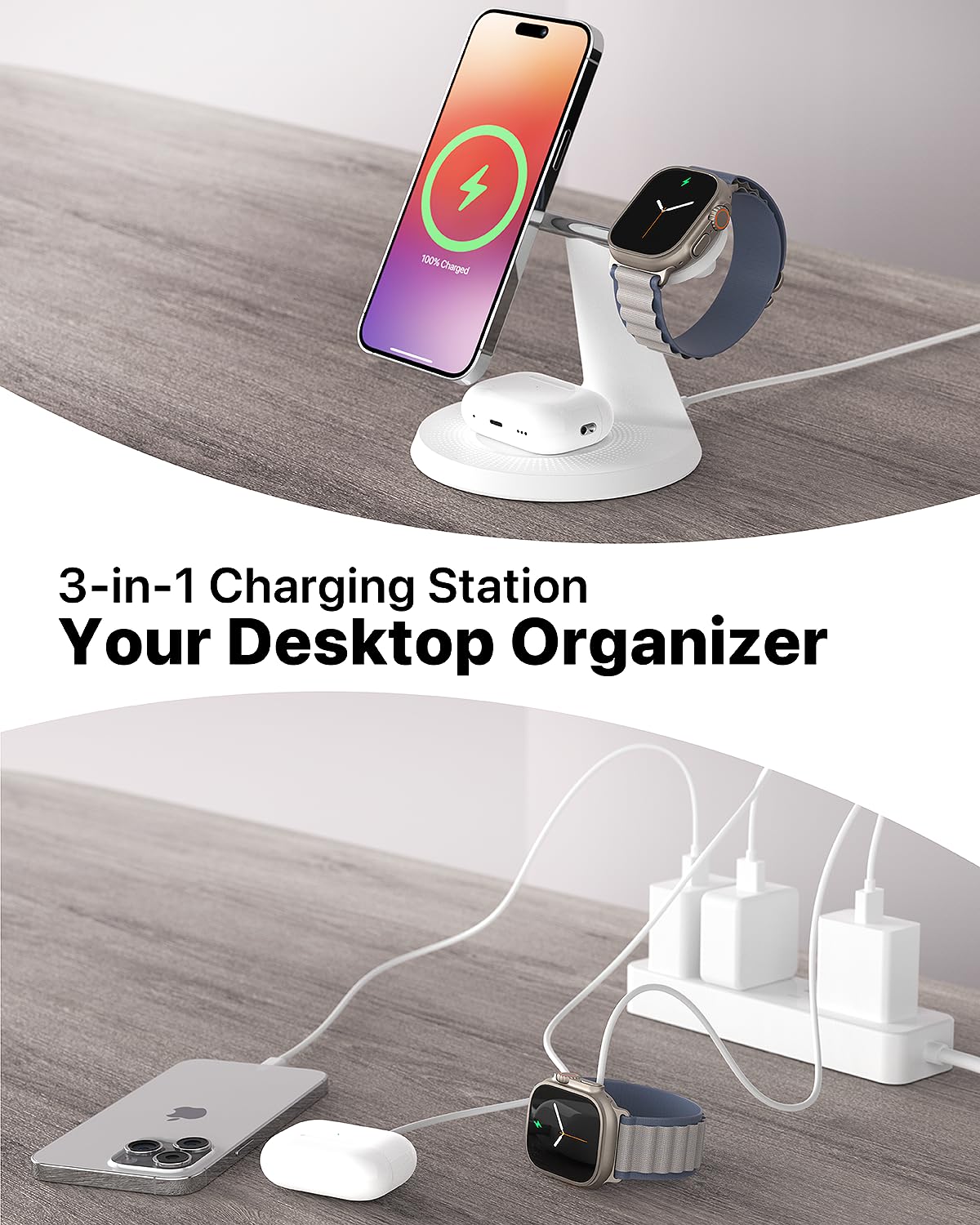 - 3-in-1 Charging Station for Apple Device: Charge your iPhone, Apple Watch, and AirPods all at once. It can also charge dual Phones and an Apple Watch simultaneously. Eliminate cable clutter and keep your desk organized